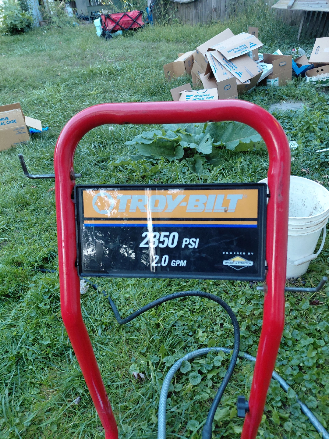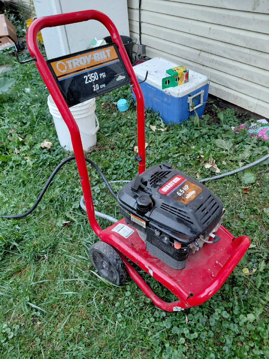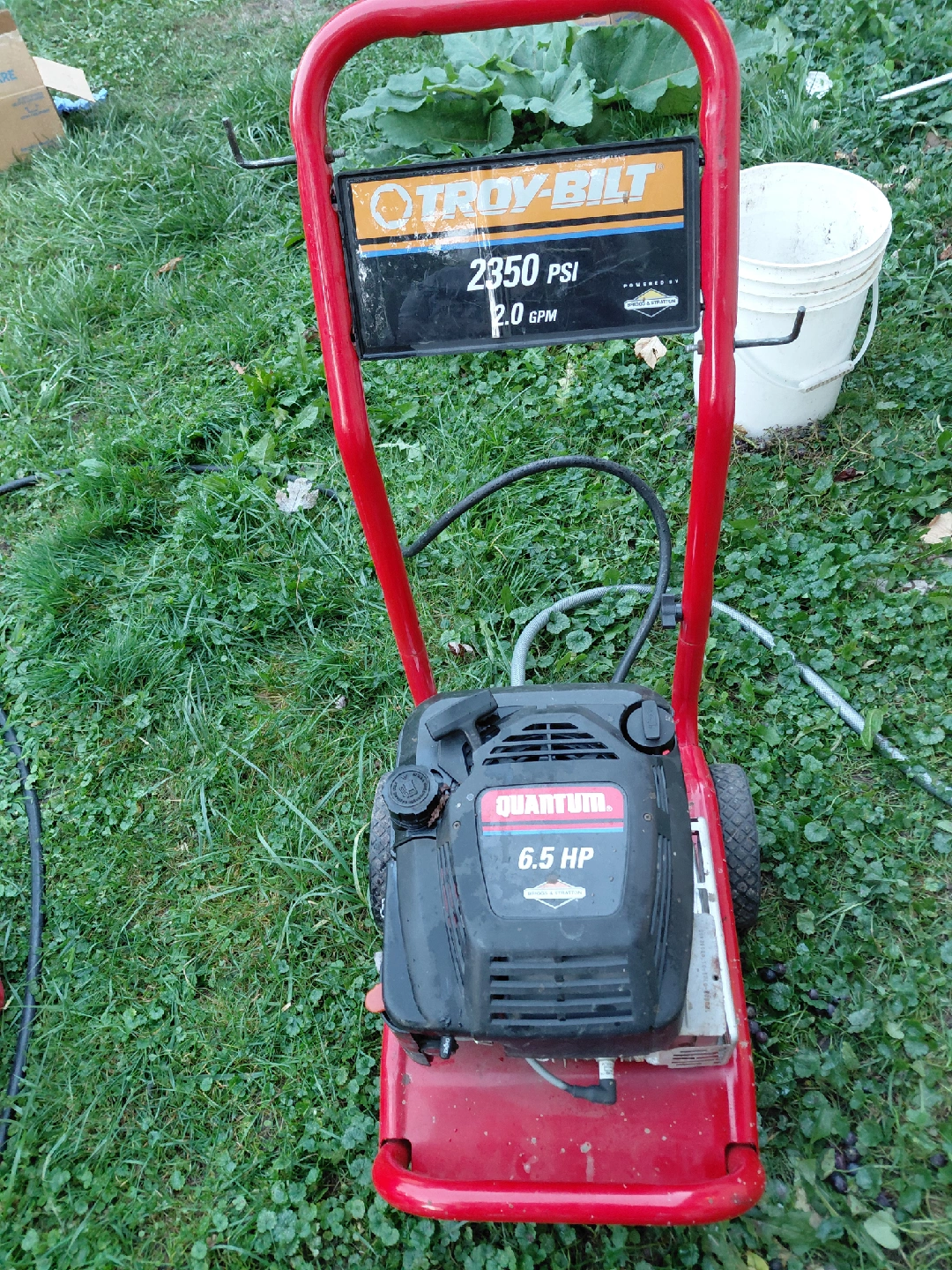 Selling a Troy-Bilt pressure washer, ready to tackle your outdoor cleaning needs! It delivers 2350 PSI at 2.0 GPM. The engine is a Quantum 6.5 HP Briggs & Stratton. 3 other Powerwashers available at only $150 one no mressure hose only $ 95