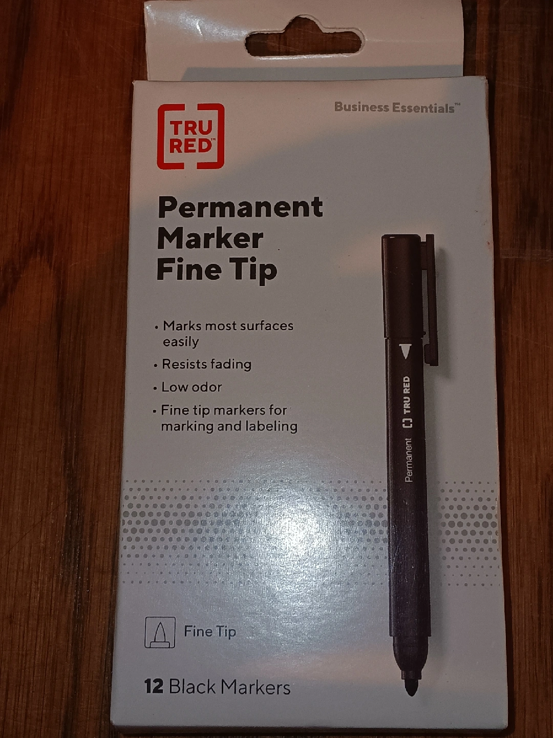 I'm selling a pack of Tru Red Fine Tip Permanent Markers. This is a pack of 12 black markers. They mark most surfaces easily and resist fading. They are low odor and great for marking and labeling