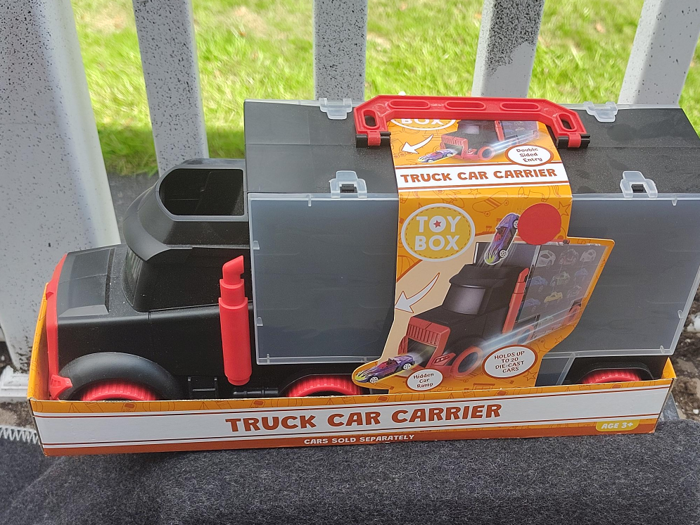 This Truck Car Carrier Toy Box is brand new and ready for a new home! It features a double-sided entry and a hidden ramp. It can hold up to 20 die-cast cars. Recommended for ages 3+