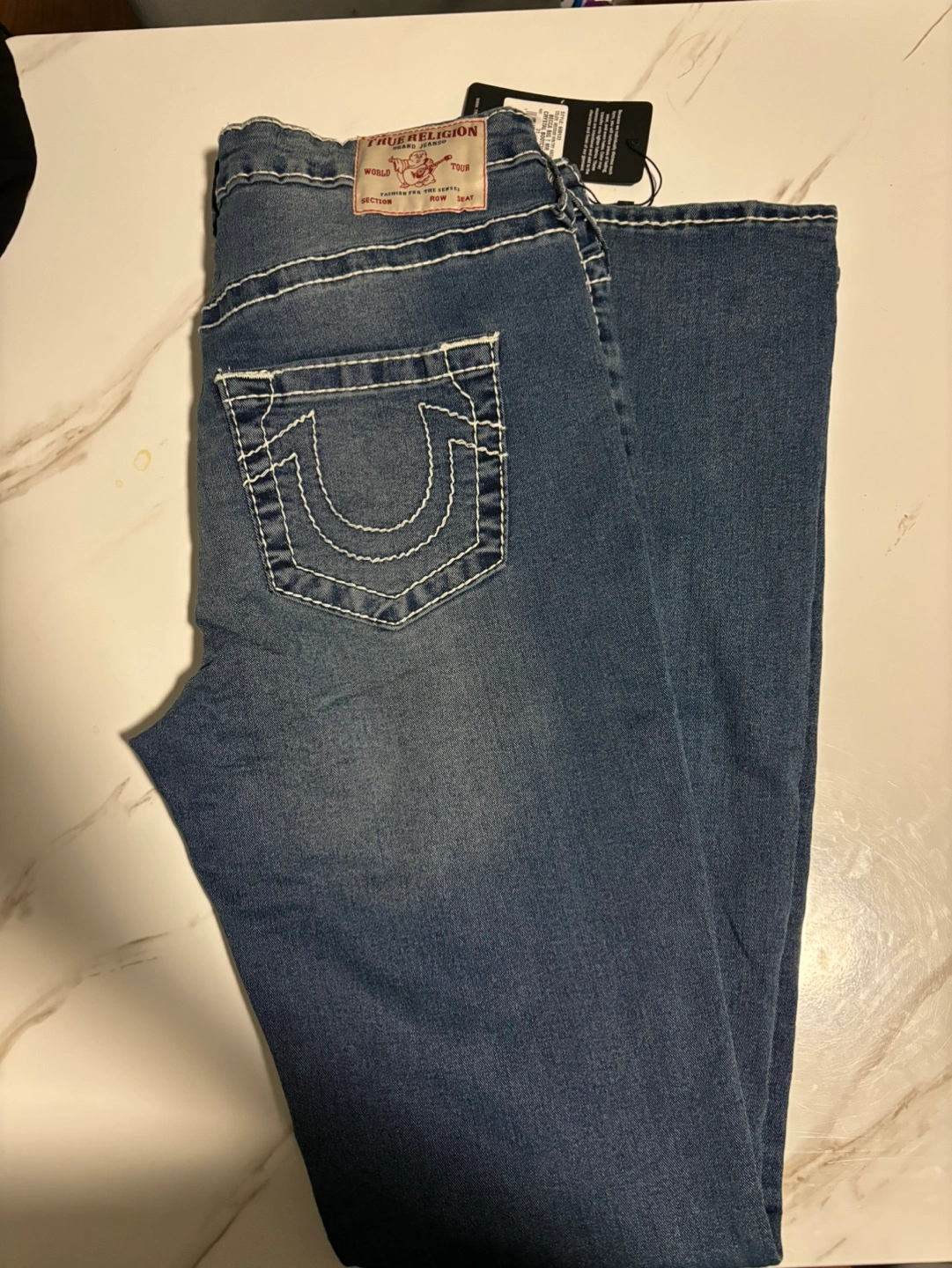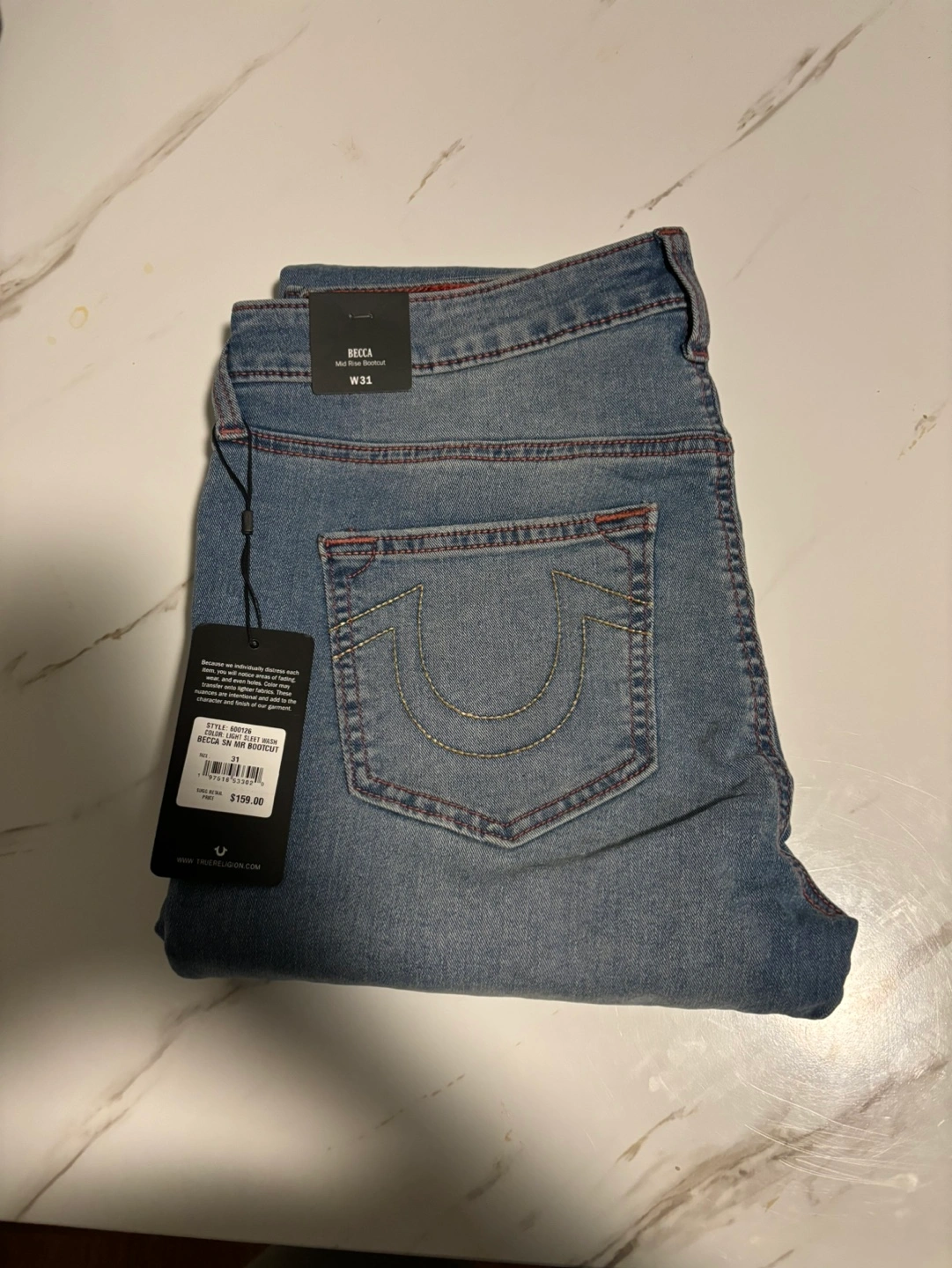 Women's True Religion Becca jeans. Size W31. Light wash denim. Red stitching accents. New with tags.