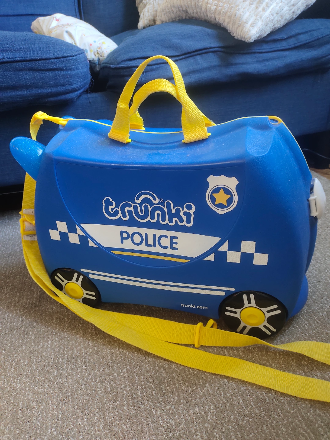 Selling a Trunki Police ride-on suitcase! It's blue with yellow accents and in great condition. Perfect for travel with kids, they can ride on it or pull it along. It's both fun and functional! Never used. Really NEW!