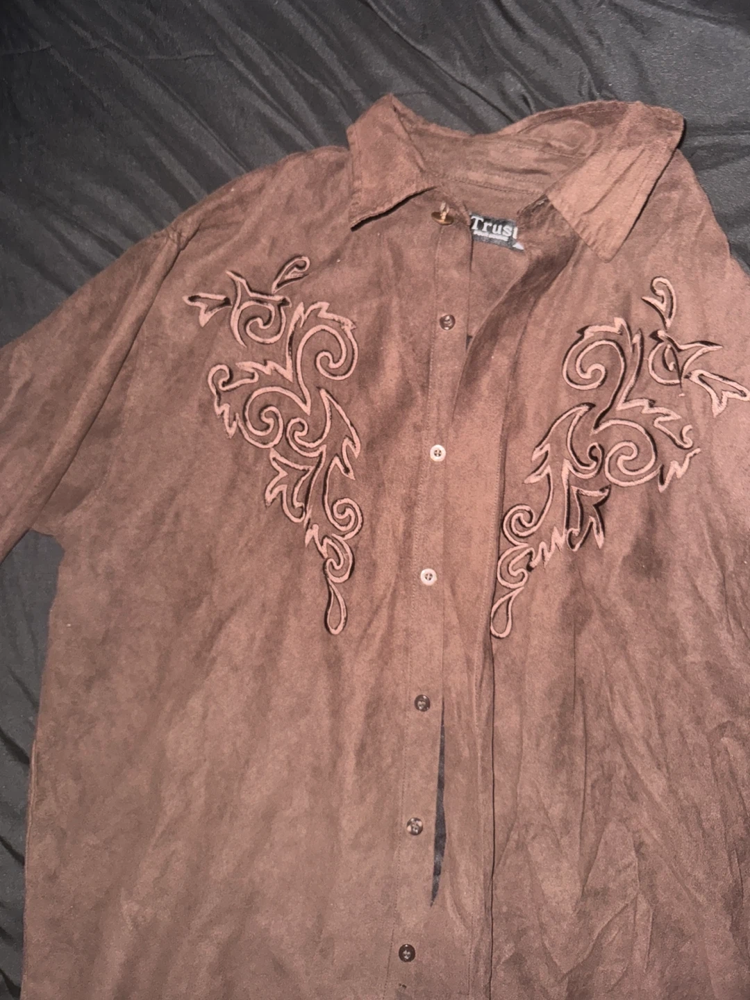 I'm selling a brown button-down shirt from the brand Trust. It features a unique embroidered design on the front. The shirt is in good condition and ready for a new home!