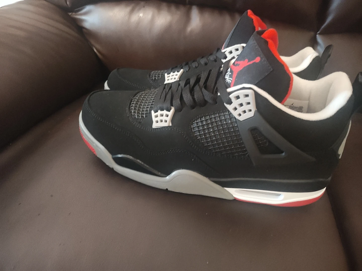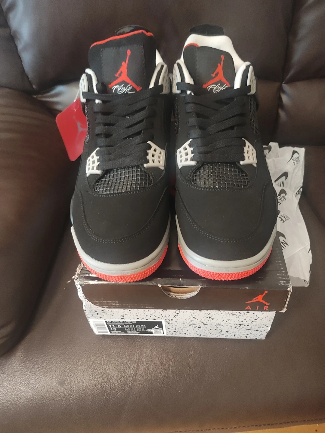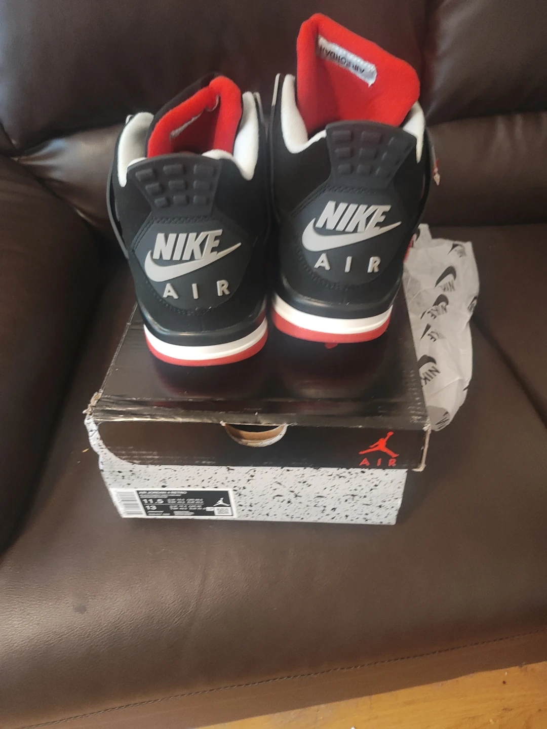 These are Nike Air Jordan 4 Retro sneakers in black with red and white accents. They're a men's size 11.5. Includes original box and tissue paper. These iconic basketball shoes are a classic for a reason!
