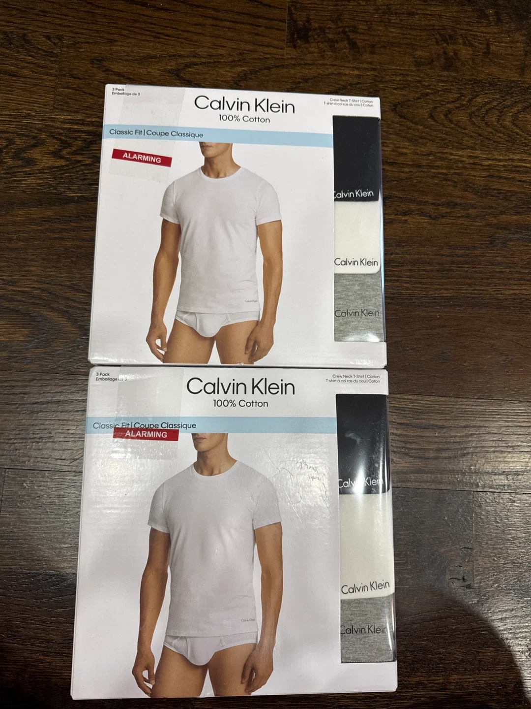 This is a 3-pack of Calvin Klein crew neck t-shirts. They're made of 100% cotton in a classic fit. Includes black, white, and grey shirts.