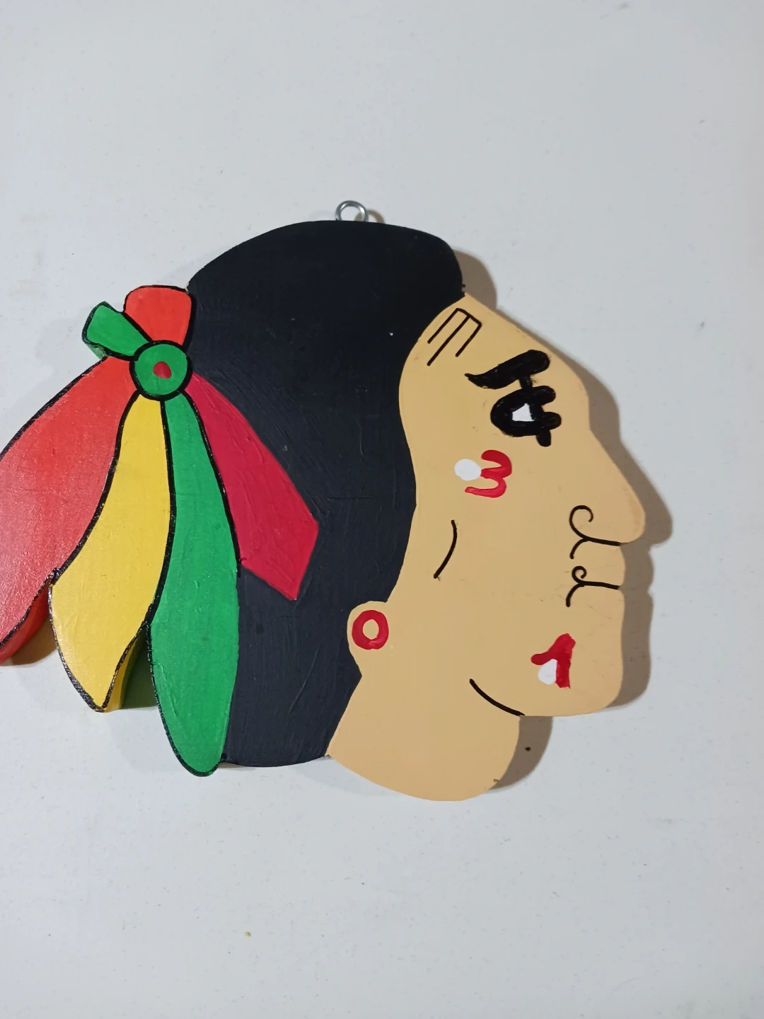 This is a colorful wooden wall hanging featuring a Native American chief's profile. It's painted with black hair, a tan face, and red, yellow, and green feathers. A small loop is attached for hanging. It's a decorative piece for your wall! I only do pickup