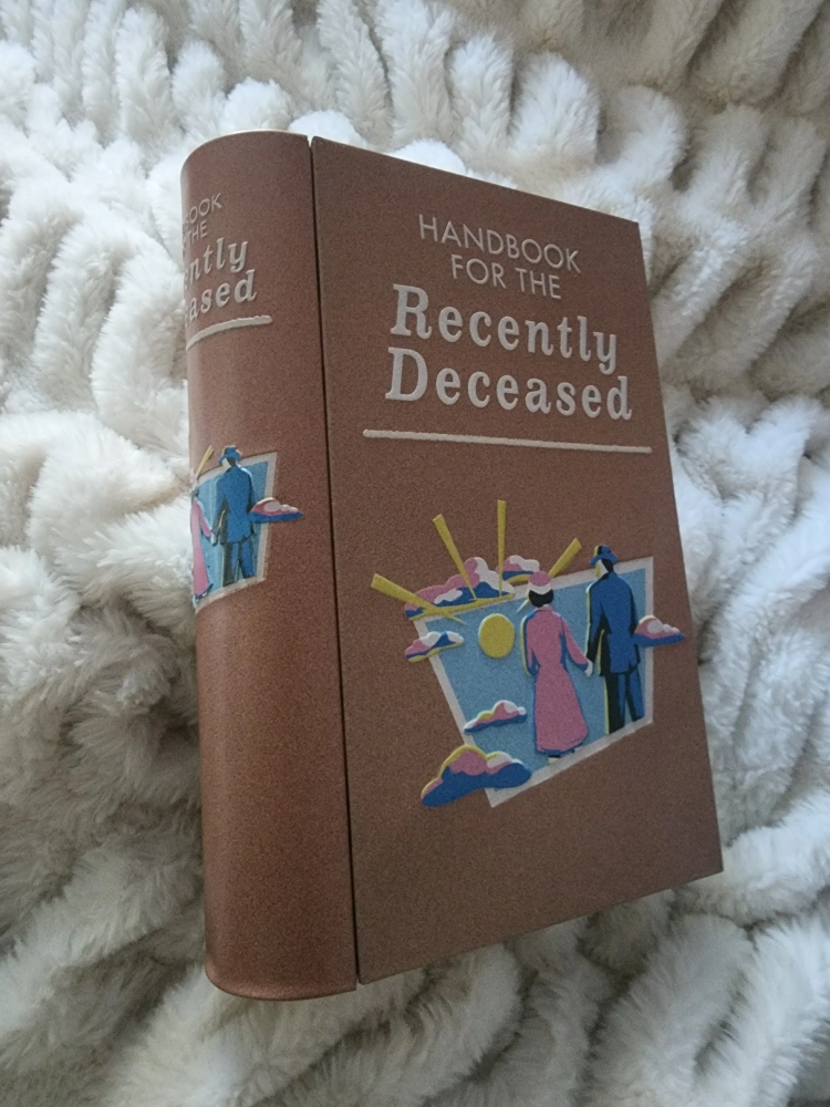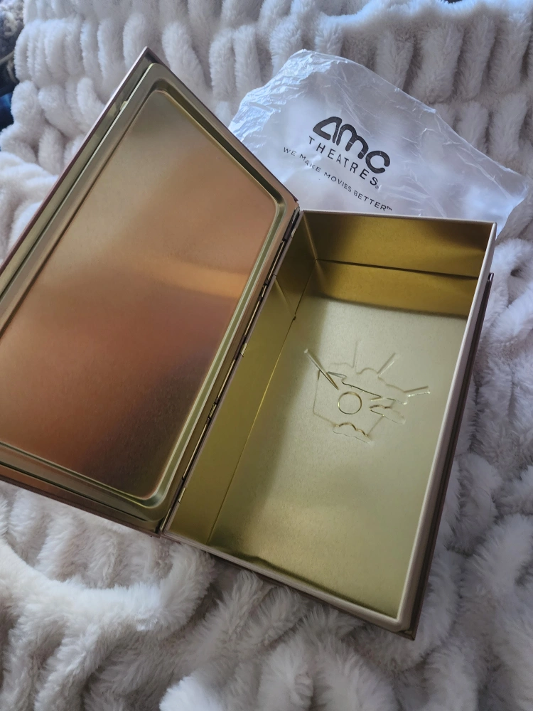 popcorn Metal tin box shaped like a book. The box is decorated with images related to the movie Beetlejuice. The box opens to reveal a gold interior with a Beetlejuice logo.