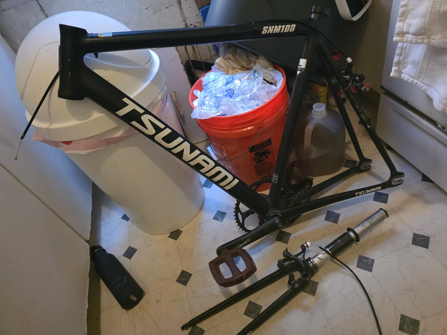 22Selling a Tsunami SNM100 bike frame in black. It appears to be in good condition and includes the frame, fork, crankset, and pedals. Great for a custom build!