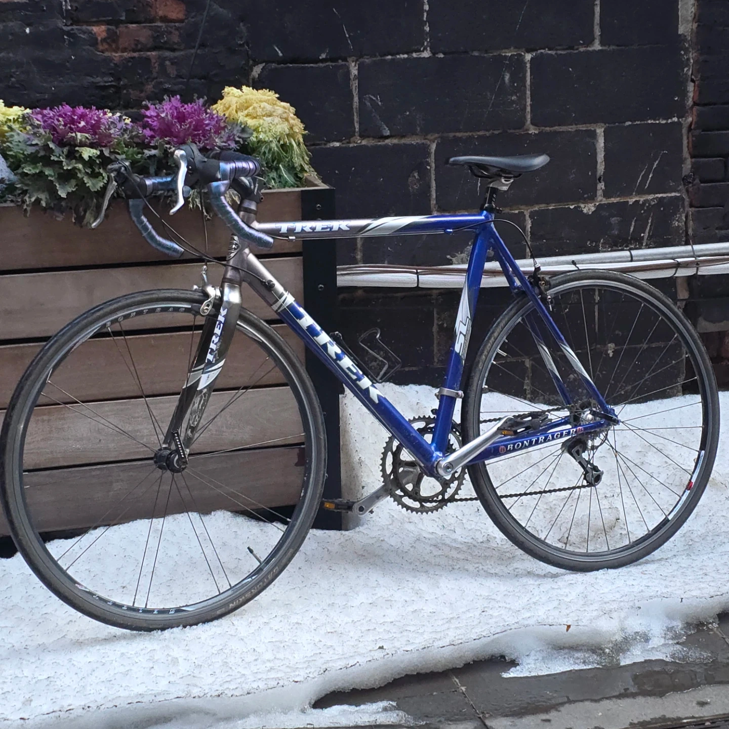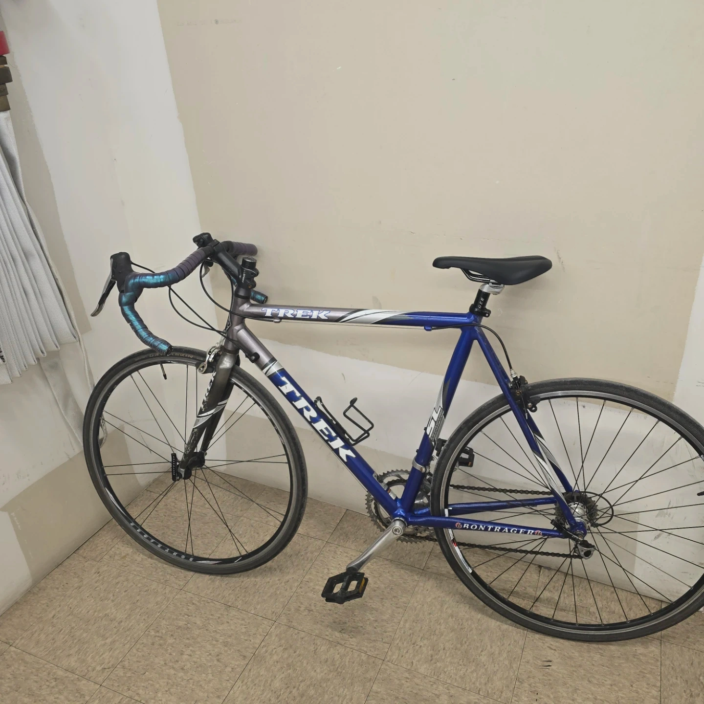 This is a Trek road bike in blue and silver. It features a Bontrager saddle and wheels. This bike is great for riding on paved surfaces.