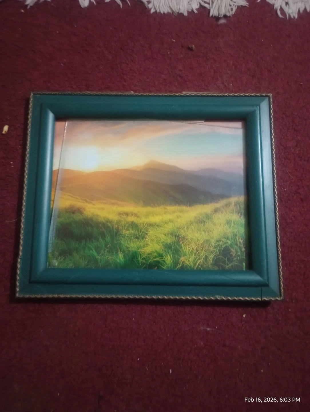 Teal picture frame with a landscape image. Frame is made of a sturdy material. It's ready to hang on your wall. This piece brings a touch of nature indoors!