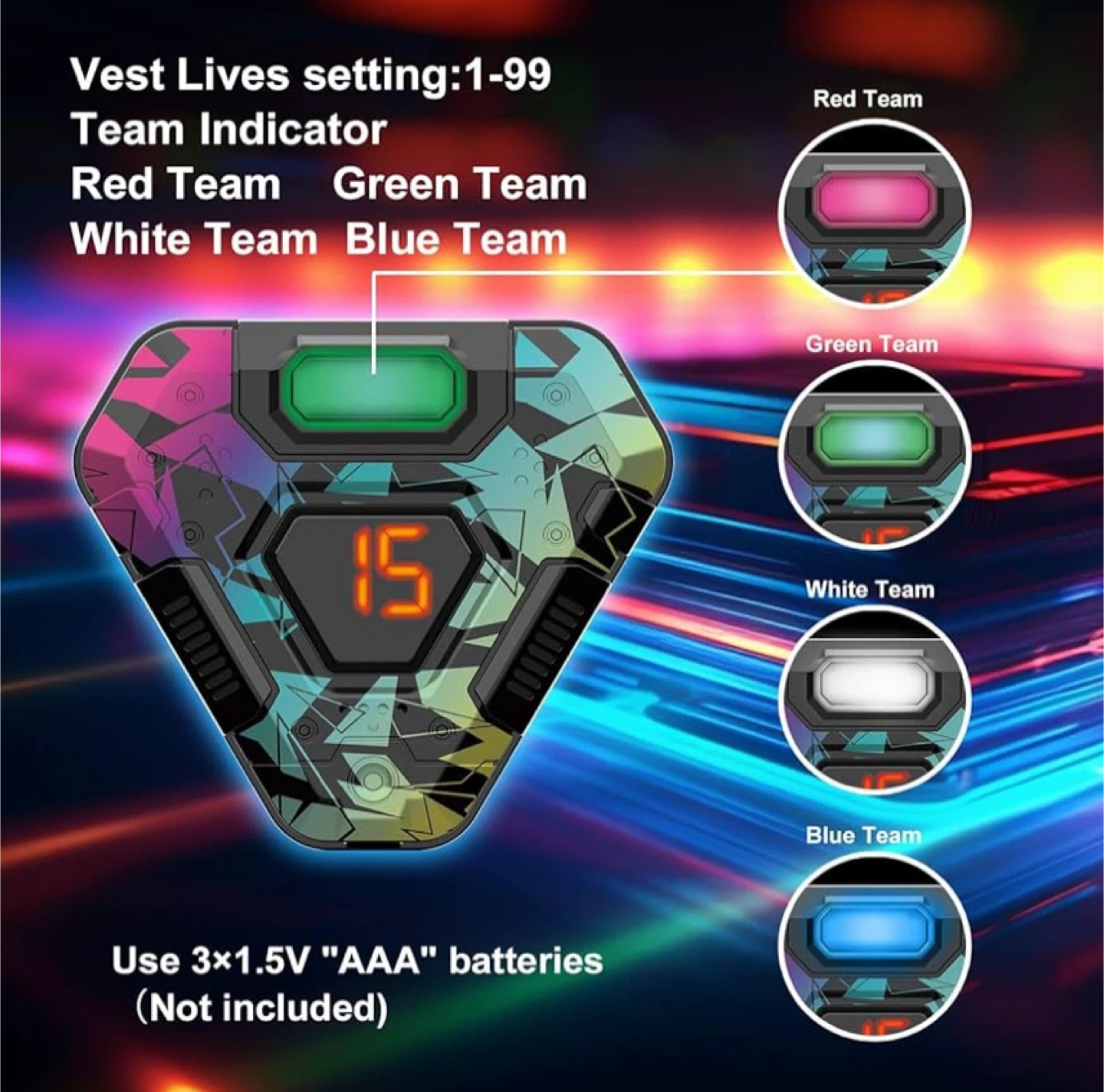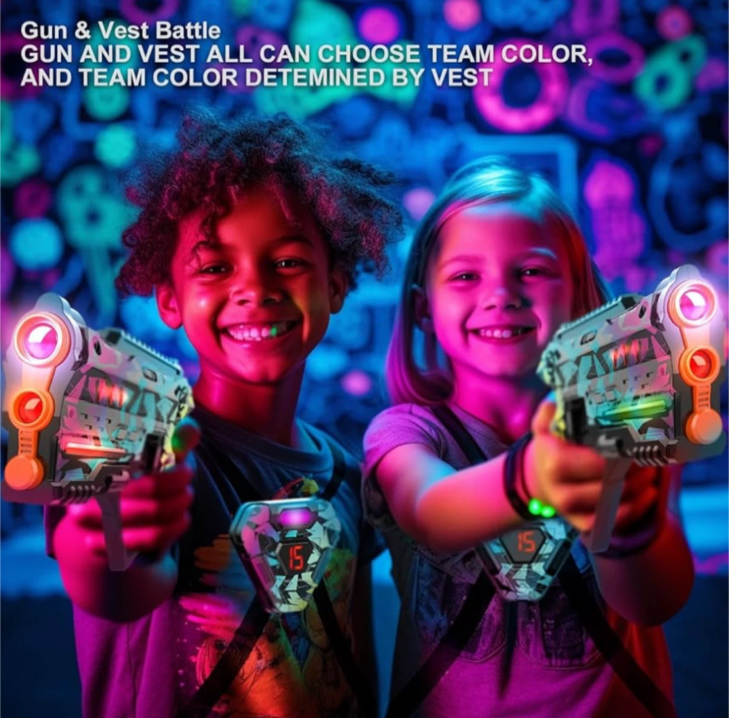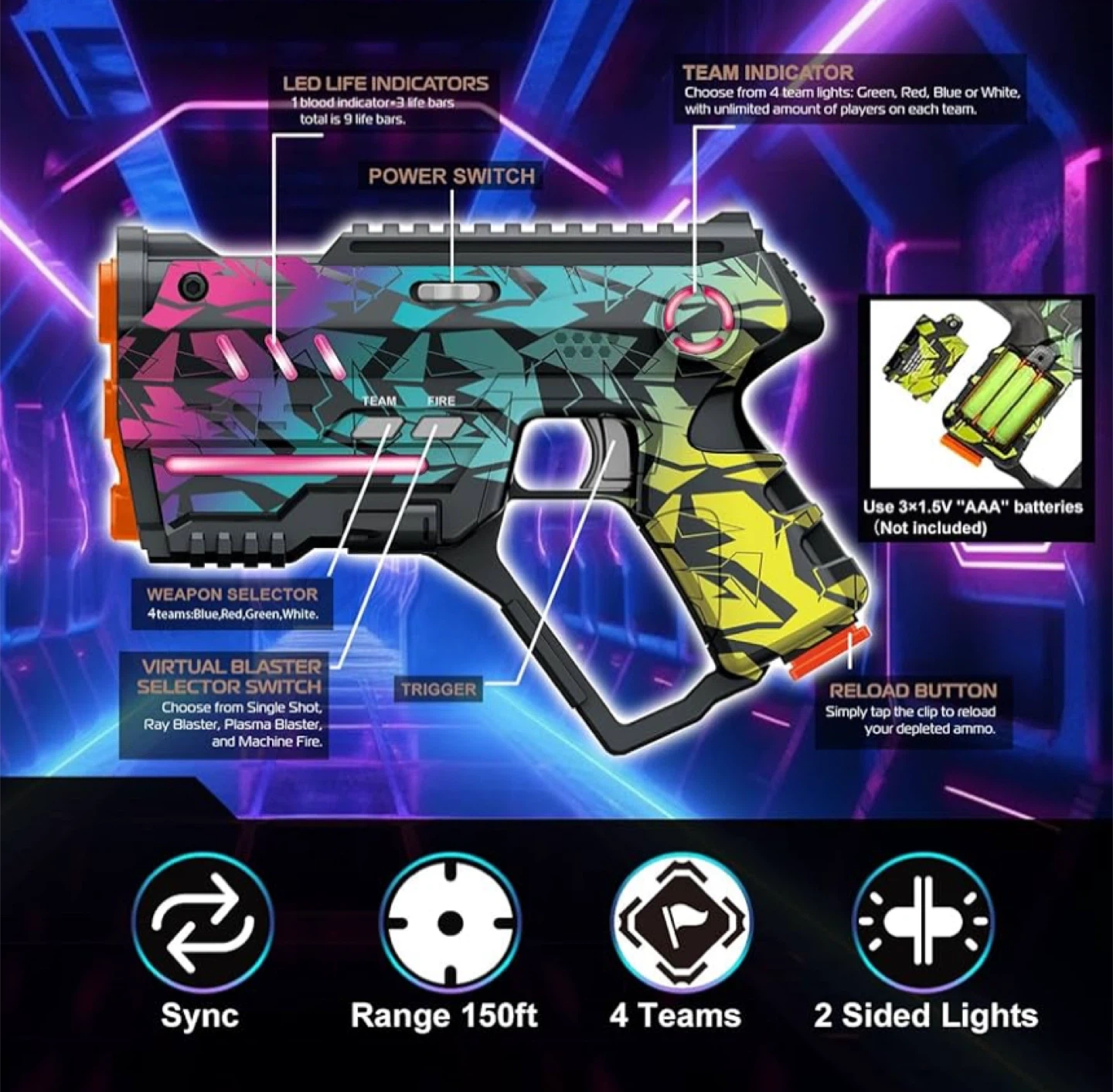 This laser tag set includes two guns and two vests, offering a virtual blaster selector with multiple shooting modes. It supports up to 4 teams and has a range of 150ft. Powered by 3x1.5V AAA batteries each (not included).