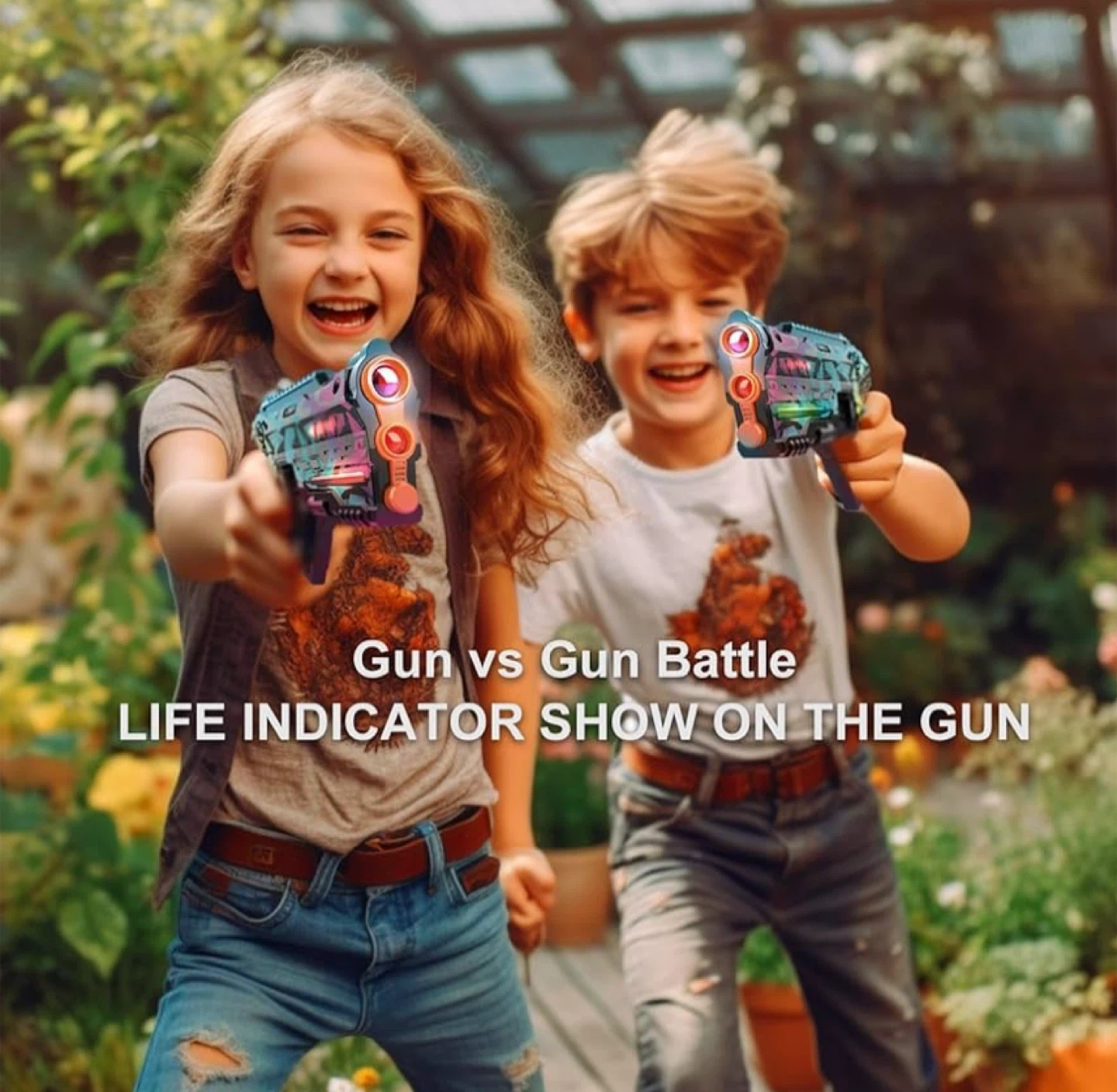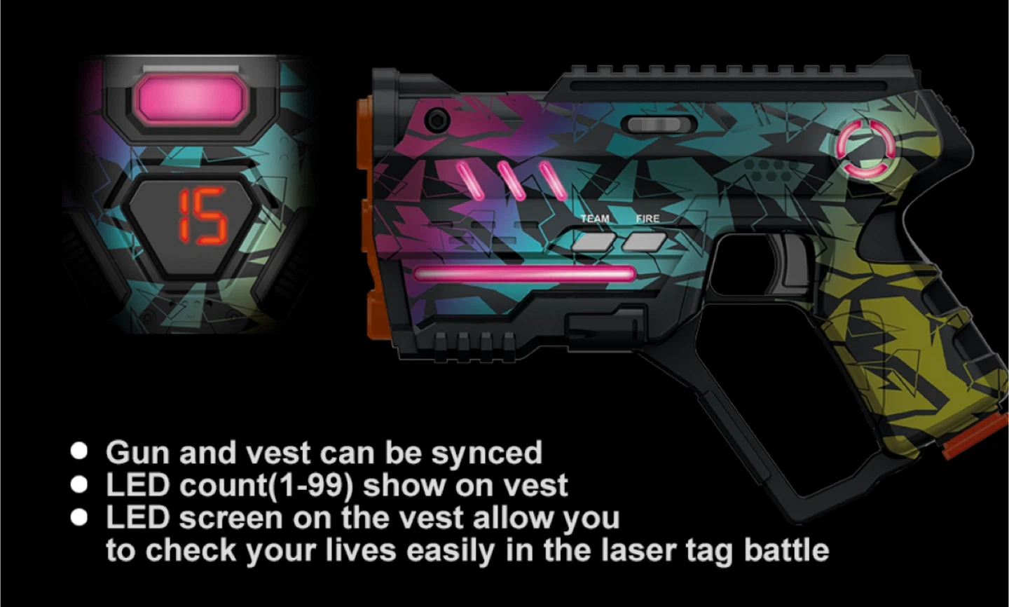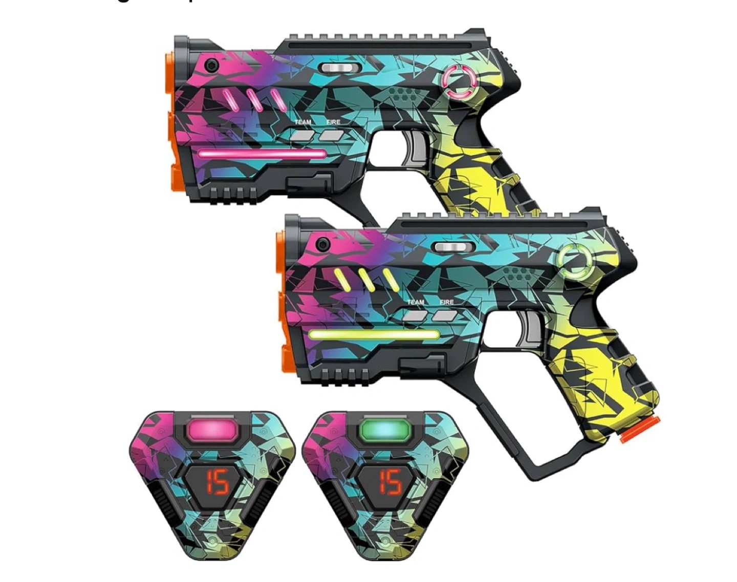This laser tag set includes two guns and two vests, offering a virtual blaster selector with multiple shooting modes. It supports up to 4 teams and has a range of 150ft. Powered by 3x1.5V AAA batteries each (not included).