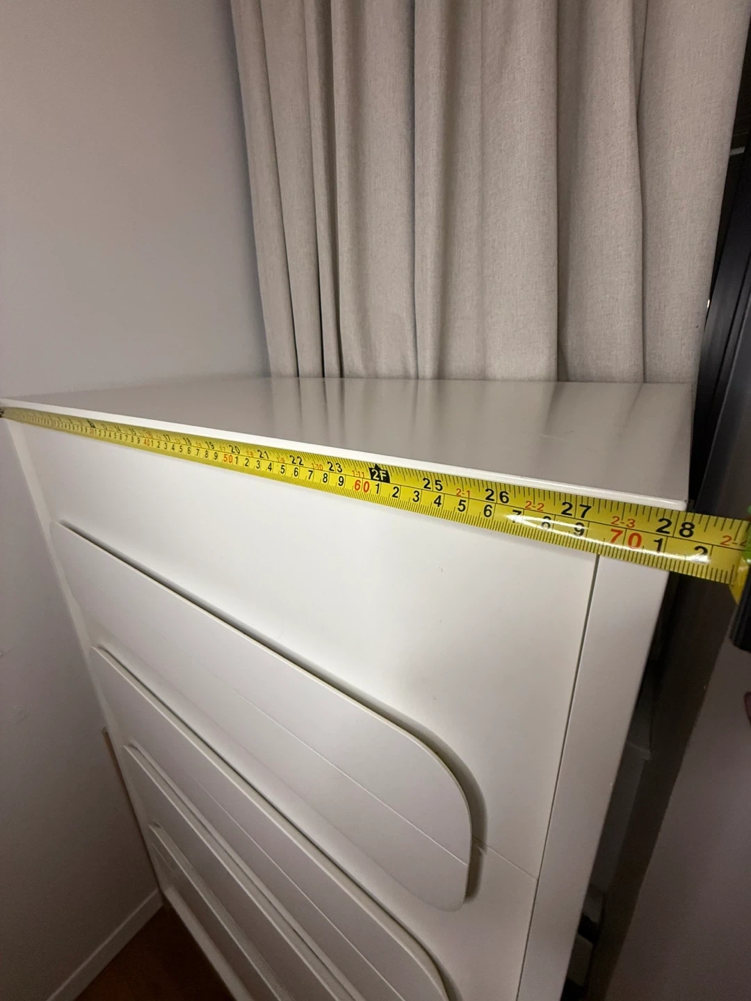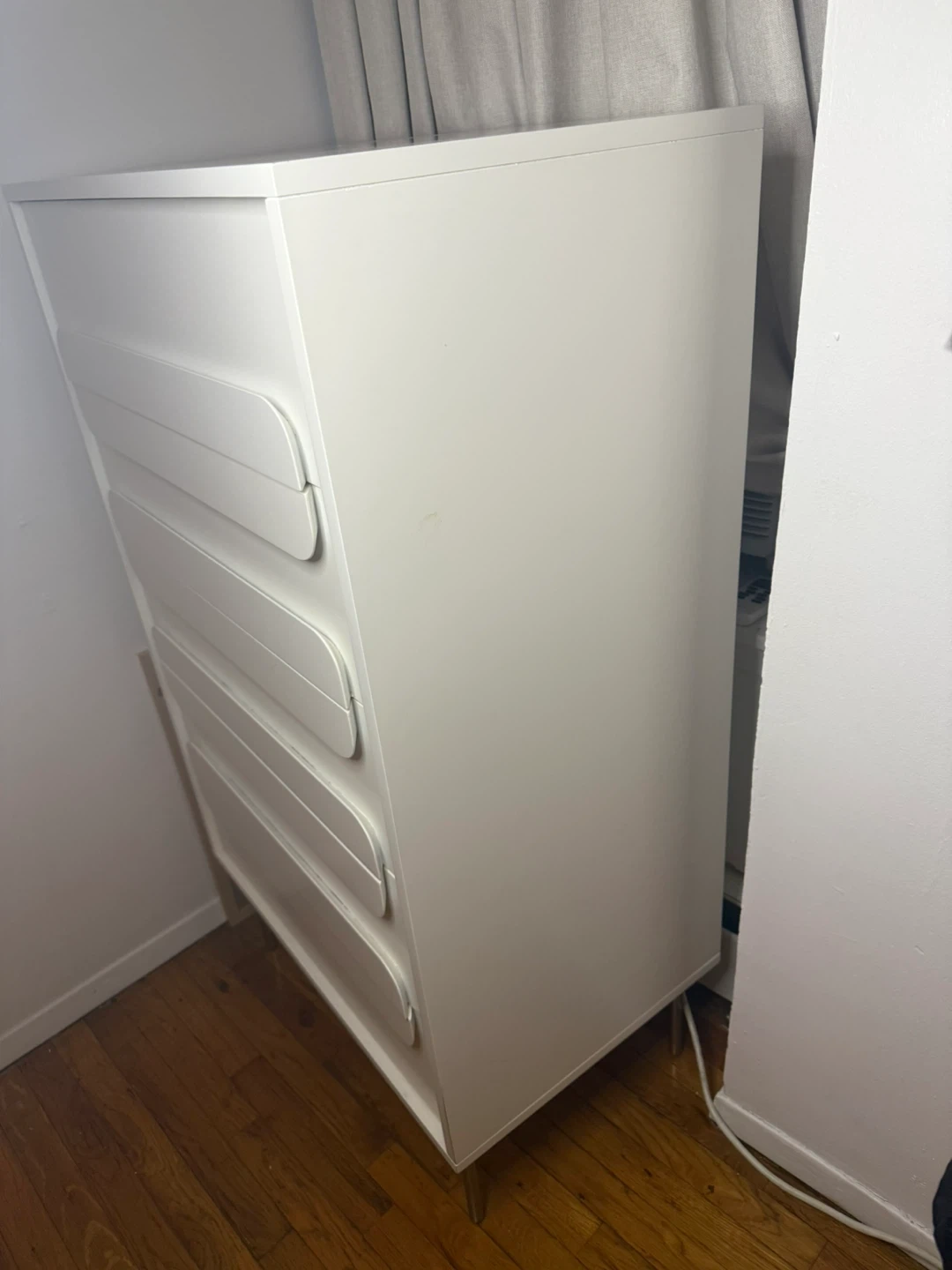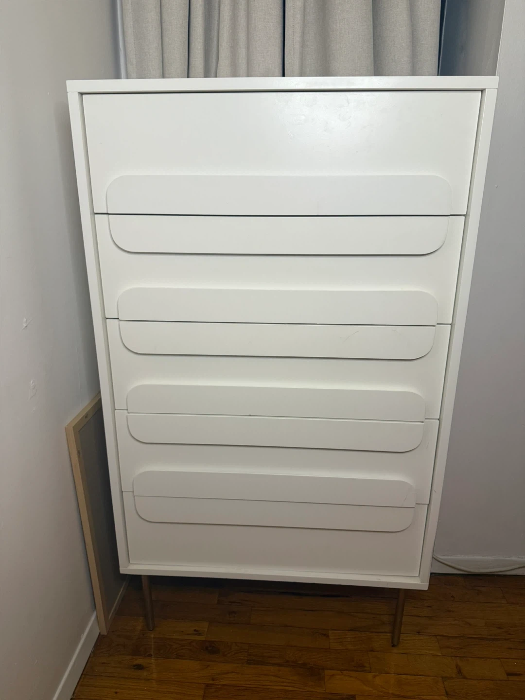 Selling a white 5-drawer dresser. It's in good condition and ready for a new home! The dresser features a sleek design with gold colored legs.