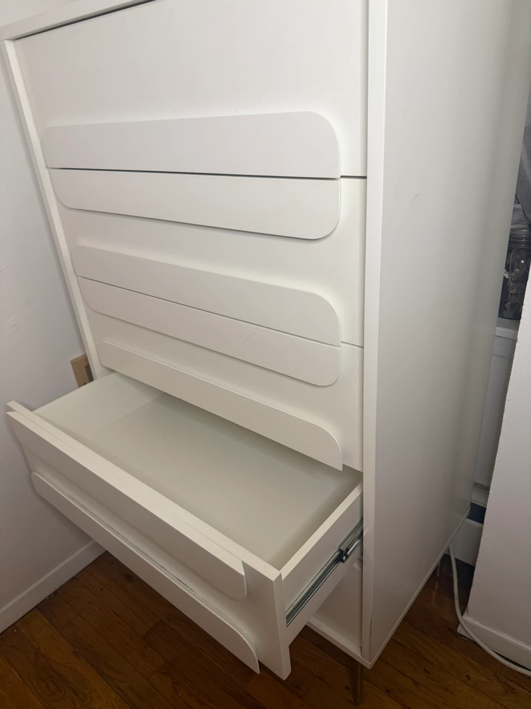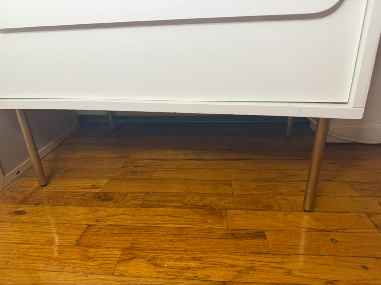 Selling a white 5-drawer dresser. It's in good condition and ready for a new home! The dresser features a sleek design with gold colored legs.