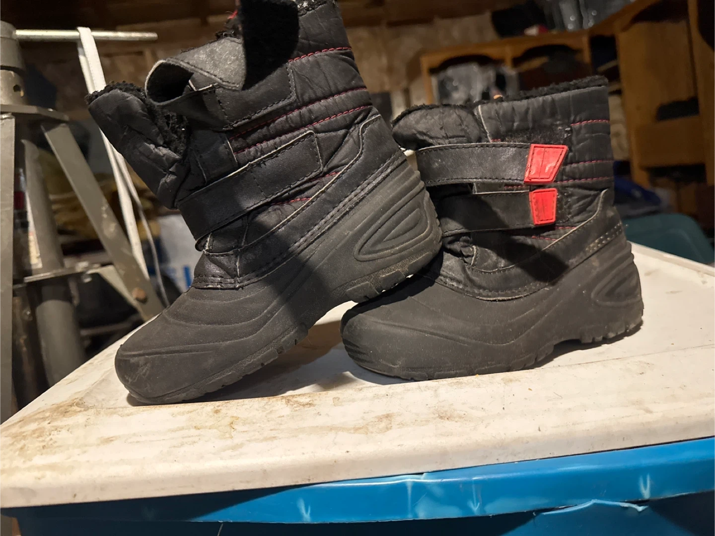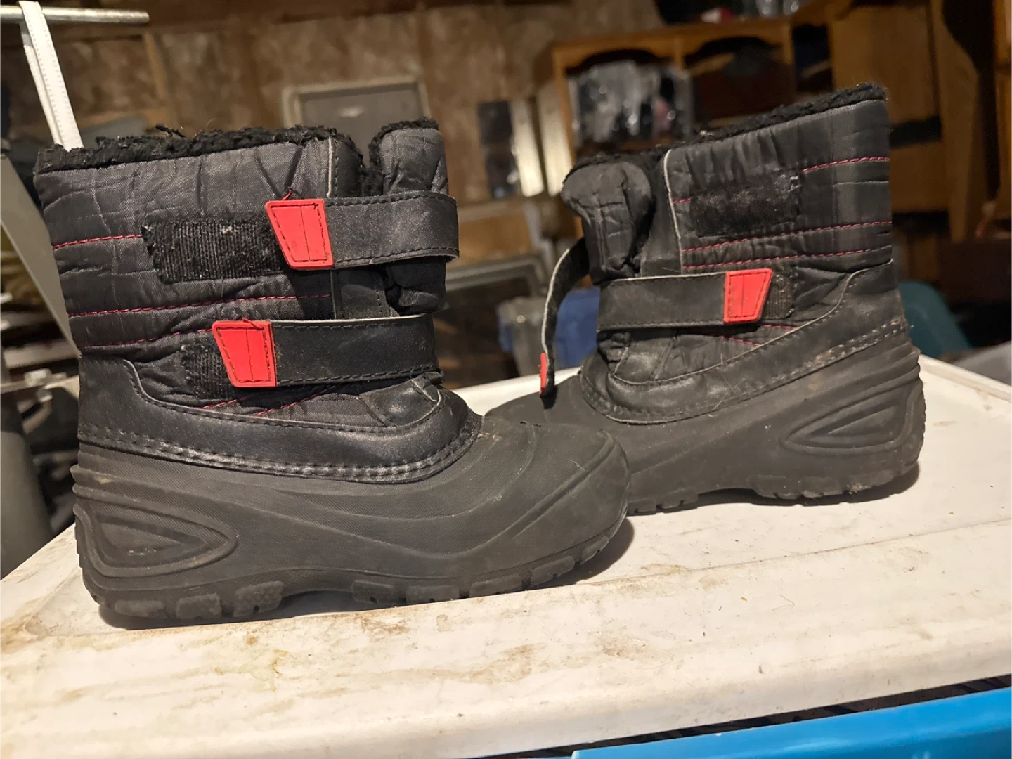 These Wonder Nation boots are black with π red accents and two adjustable straps for a secure fit. The soles have good tread for traction. They're insulated for warmth during winter weather.(13size youth)