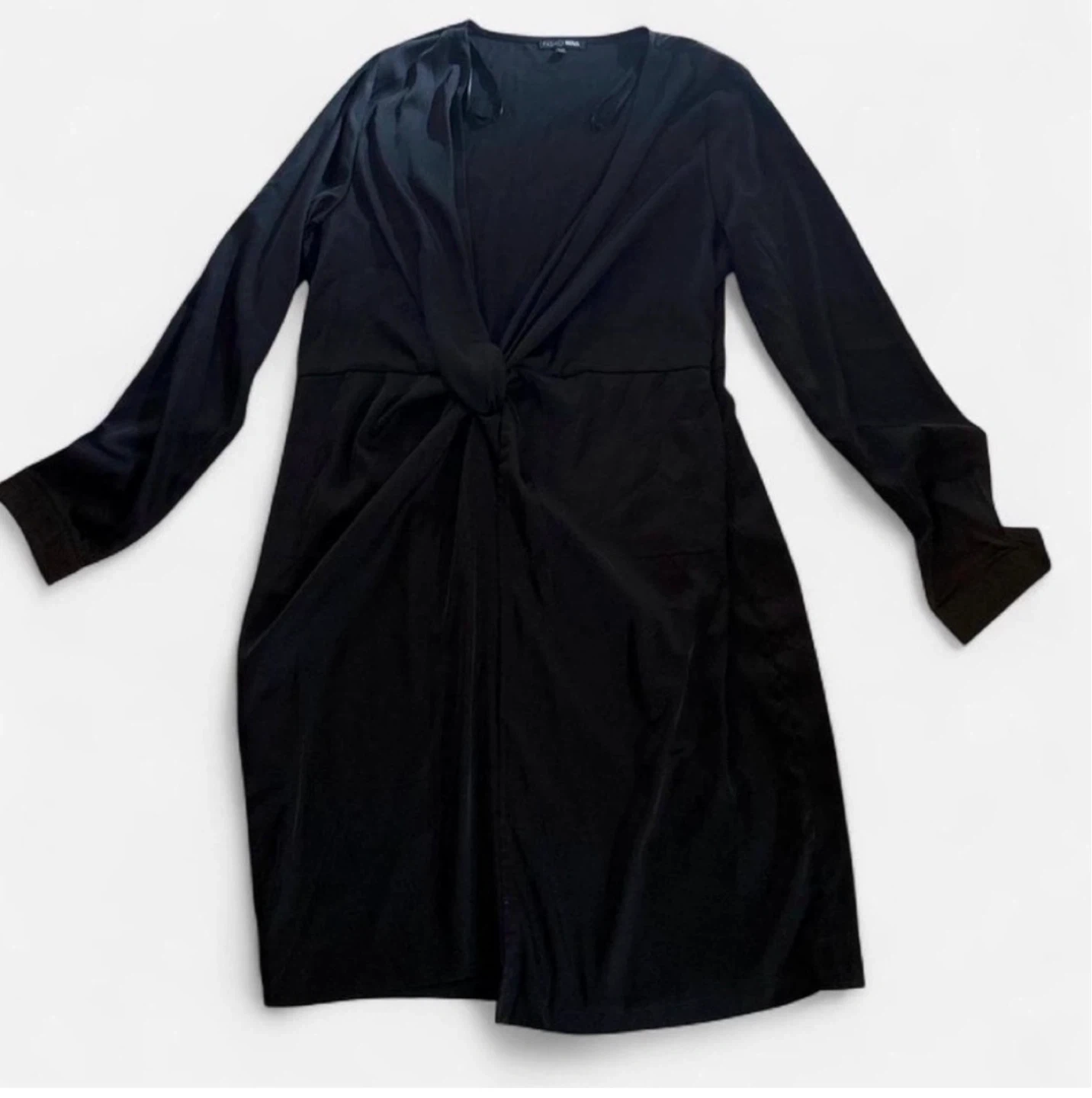 This Fashion Nova black dress features a twist front detail and long sleeves. It's made from 96% polyester and 4% spandex. Dress is size 1X.