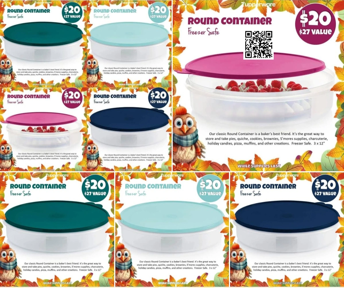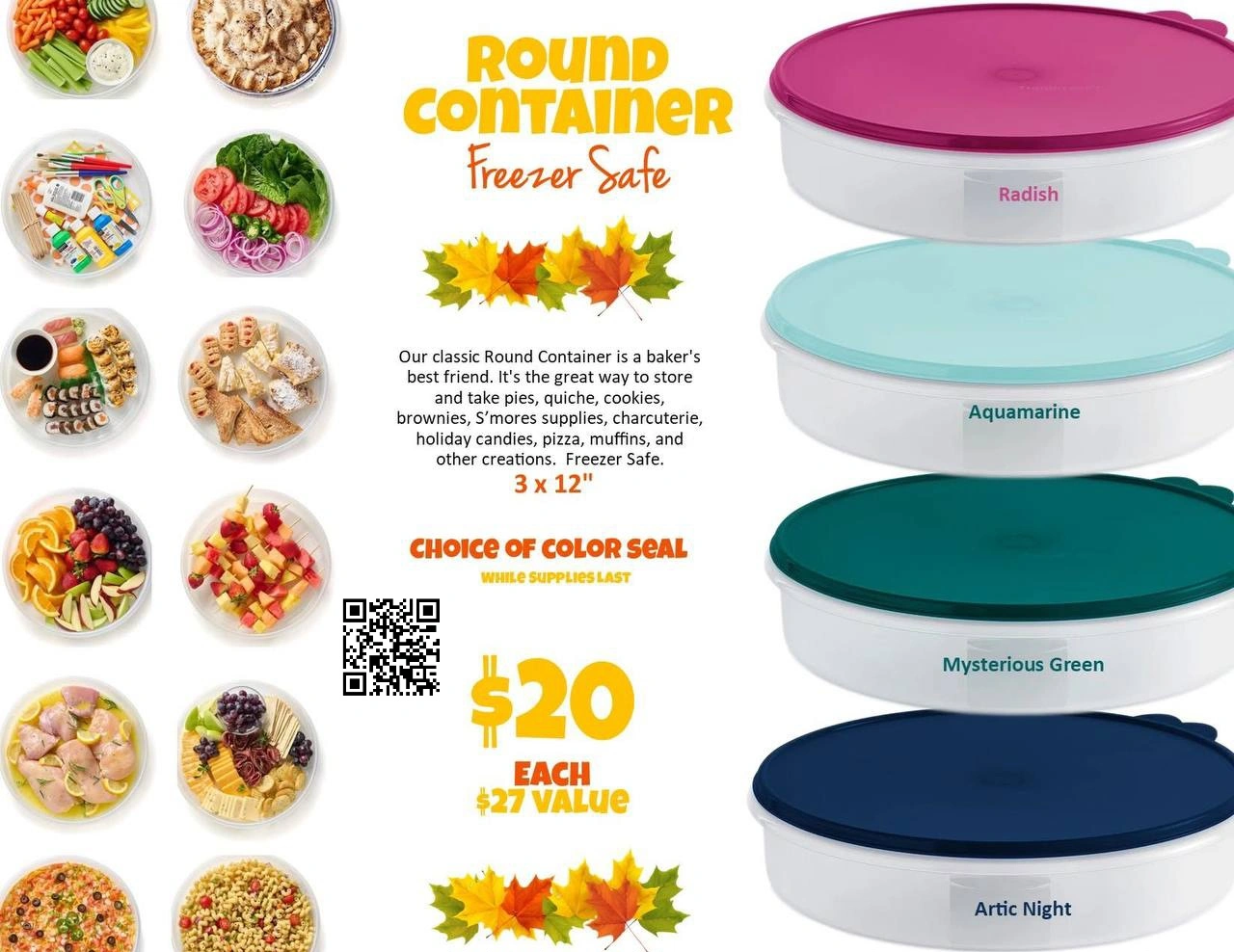 I'm selling a Tupperware round container, perfect for storing food in the freezer. It's freezer safe and measures 3 x 12 inches. This classic container is great for baking needs, including pies, quiche, cookies, brownies, and more! It's also great for holiday candies, pizza, muffins, and other creations