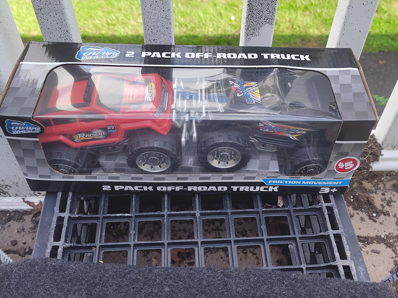 Selling a brand new, in-box Turbo Wheels 2-Pack of Off-Road Trucks! These trucks feature friction movement and are suitable for ages 3+