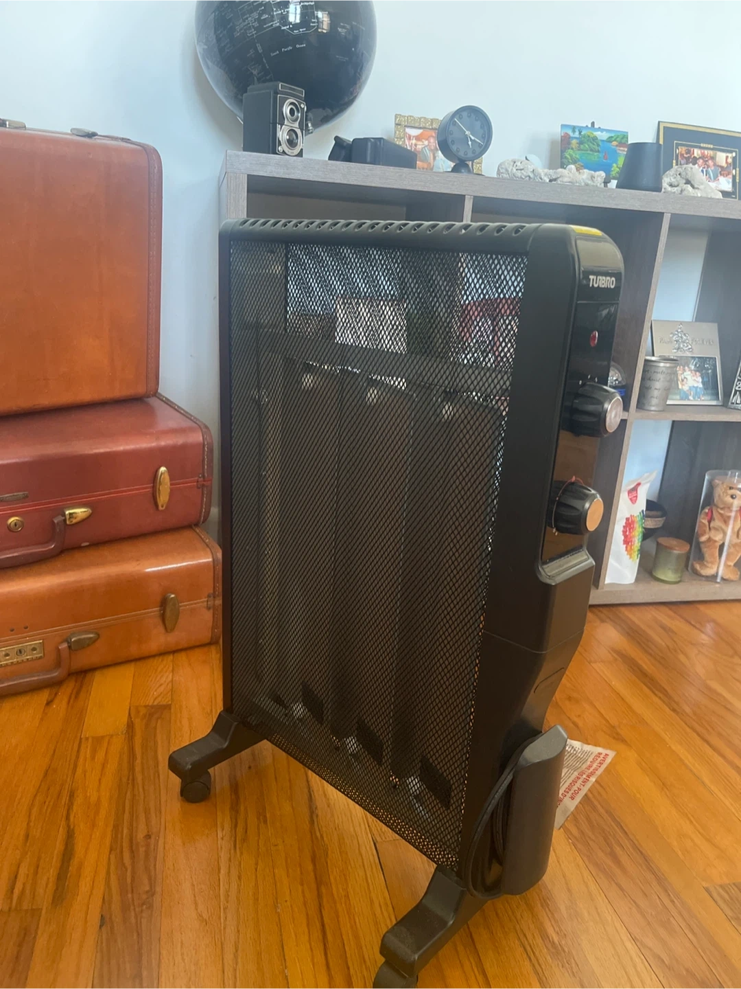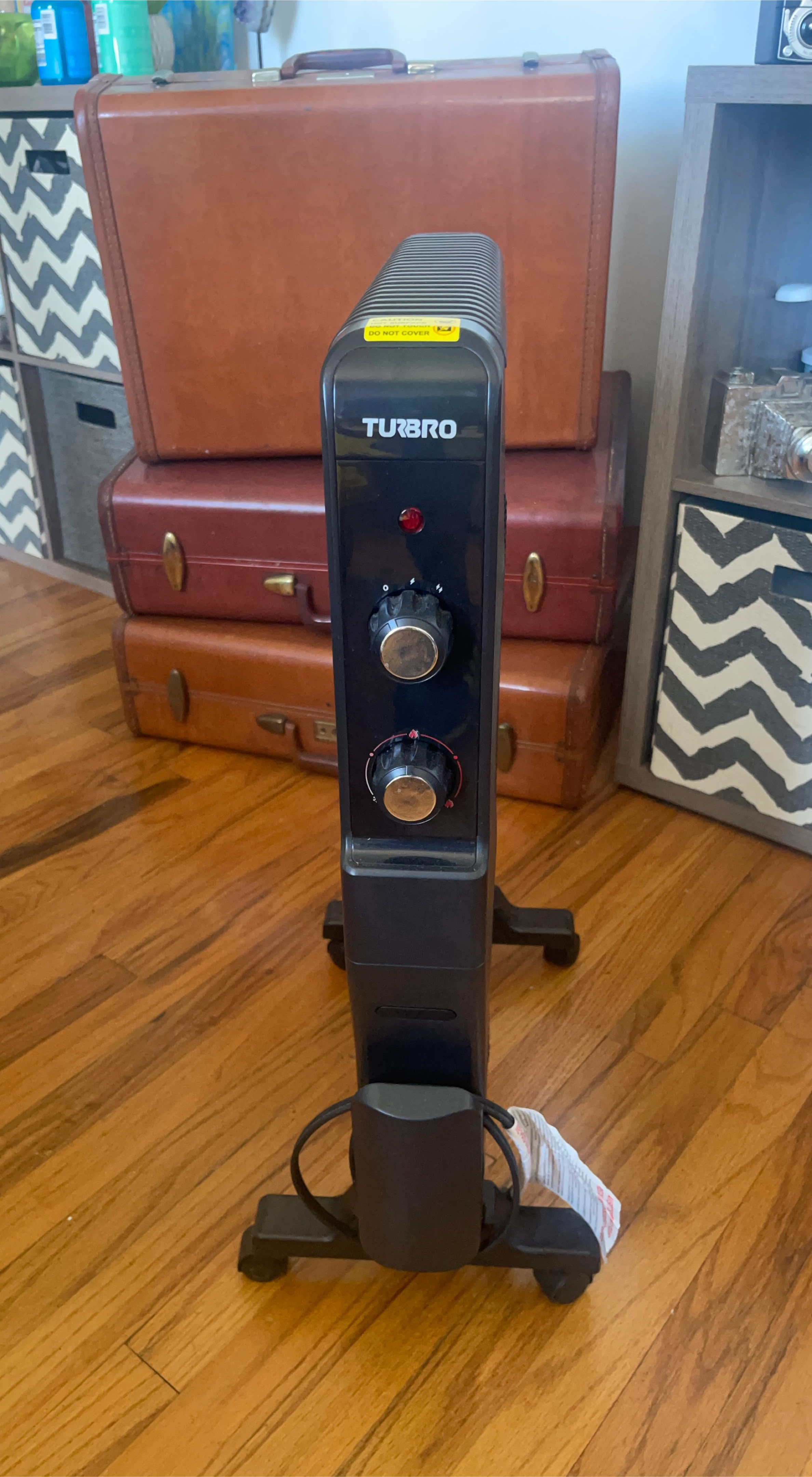 I'm selling a TURBRO electric space heater. It is black and in great condition. Perfect for heating up a room quickly and efficiently. It has adjustable settings to control the temperature. It's a great way to stay warm during the colder months