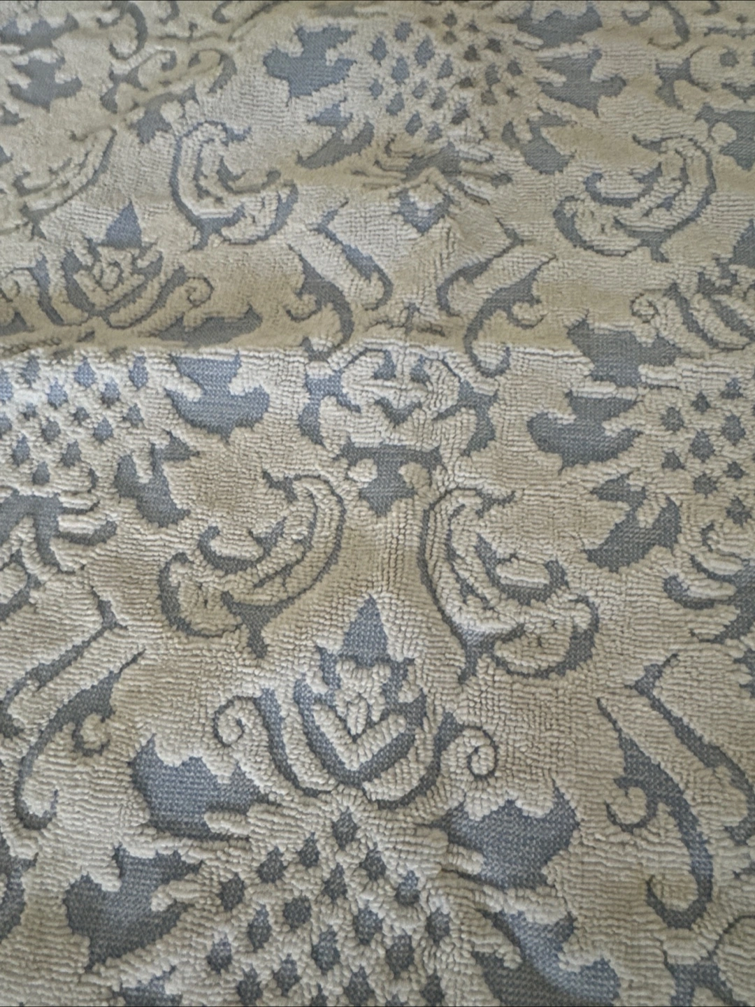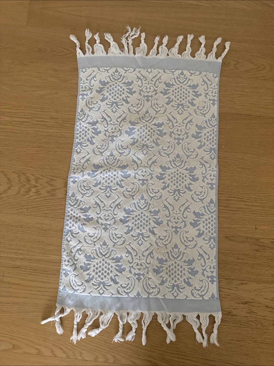 Bought in Turkey. Blue and white damask pattern. Fringe detail. Works as hand towel or bath rug.