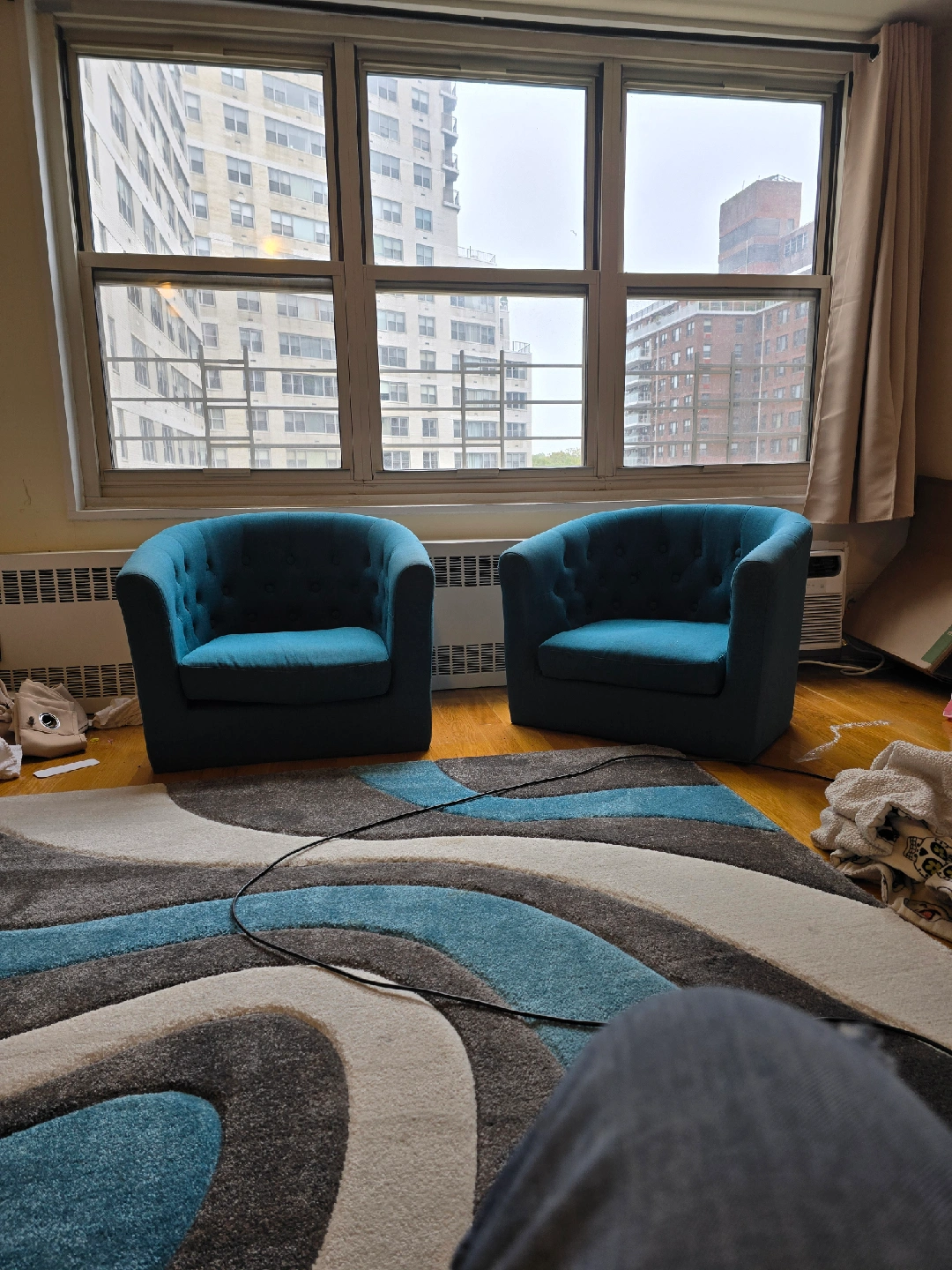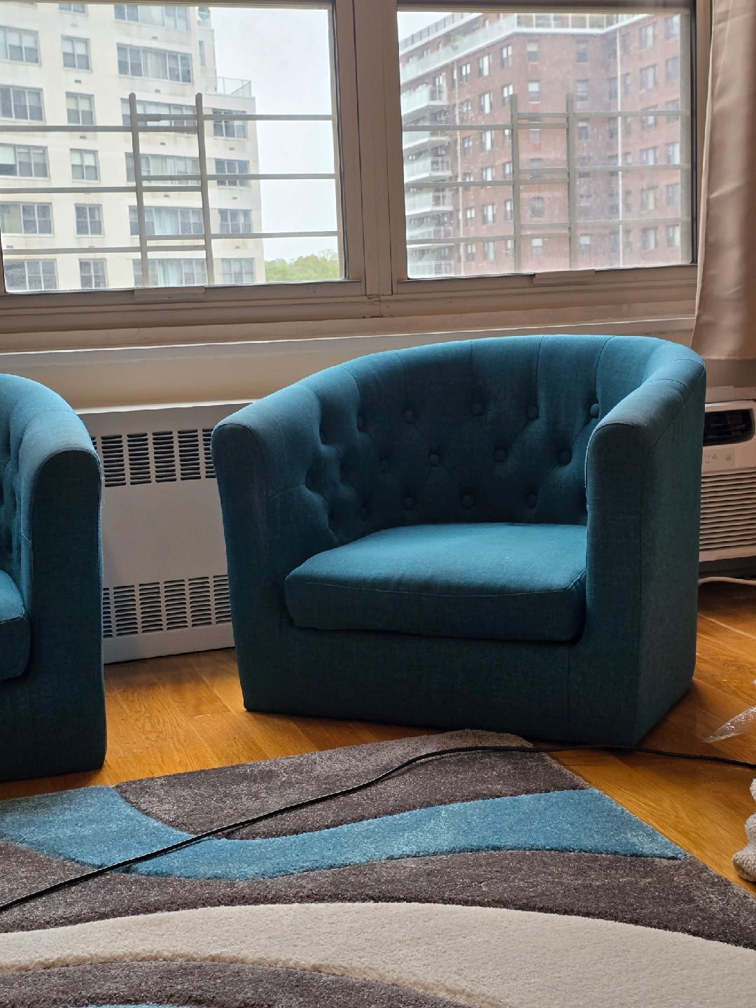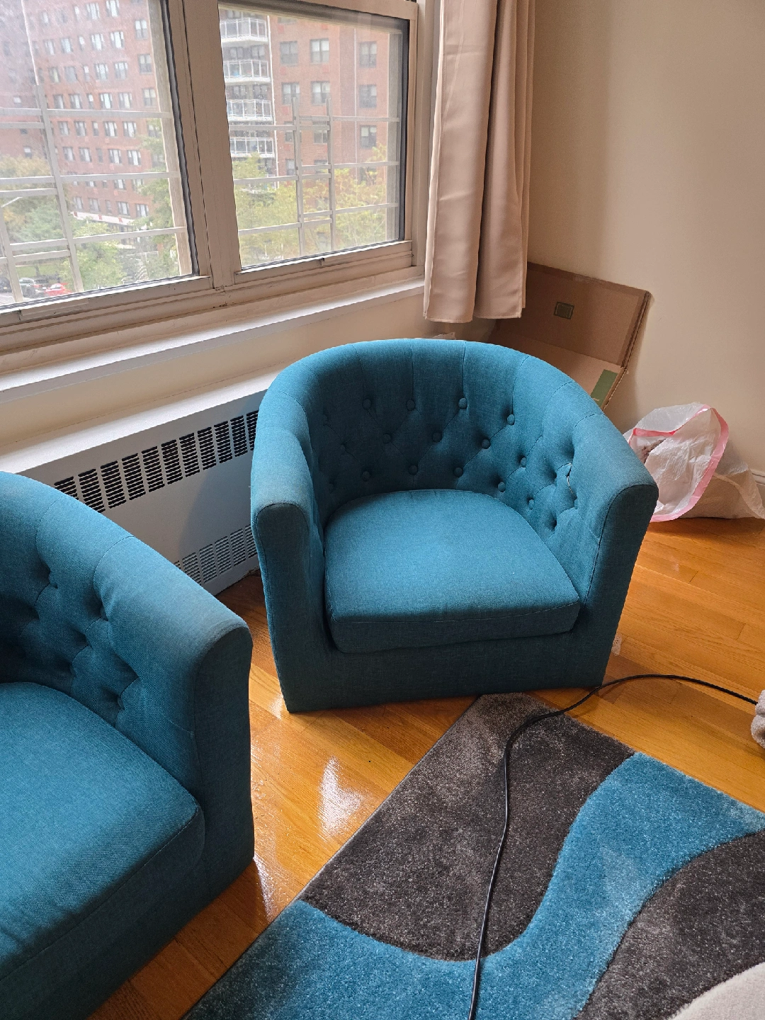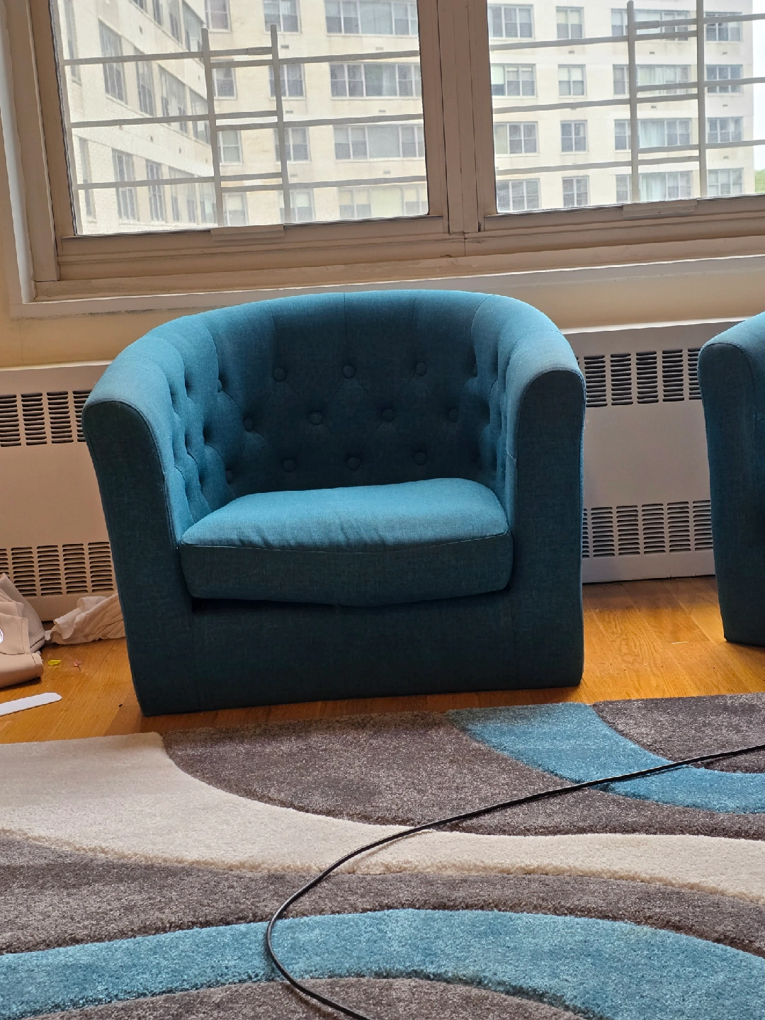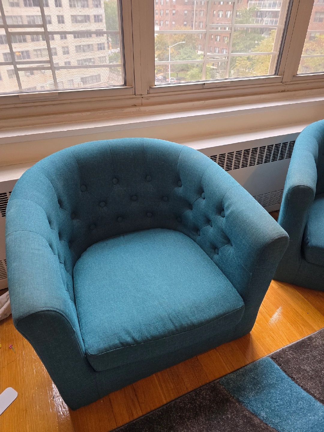Never installed legs. They are available-Selling a comfy blue tufted accent chairs. They are in good condition and would look great in any living room or bedroom! The chair features a classic tufted design and a cozy seat. $50.00 Each Both for $80.00