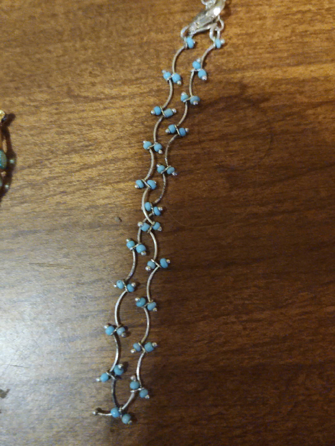 65This is a delicate silver bracelet with small turquoise beads. It's a lovely piece to add a touch of color to any outfit. The bracelet is in good condition and ready for a new home!
