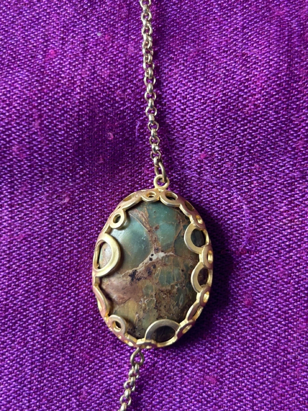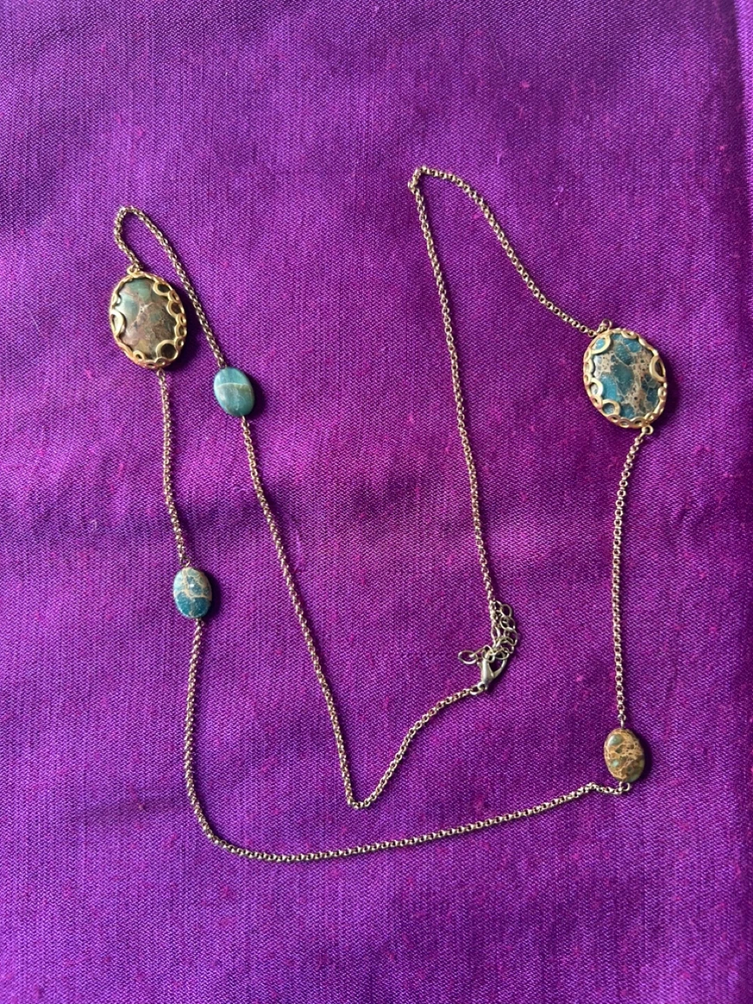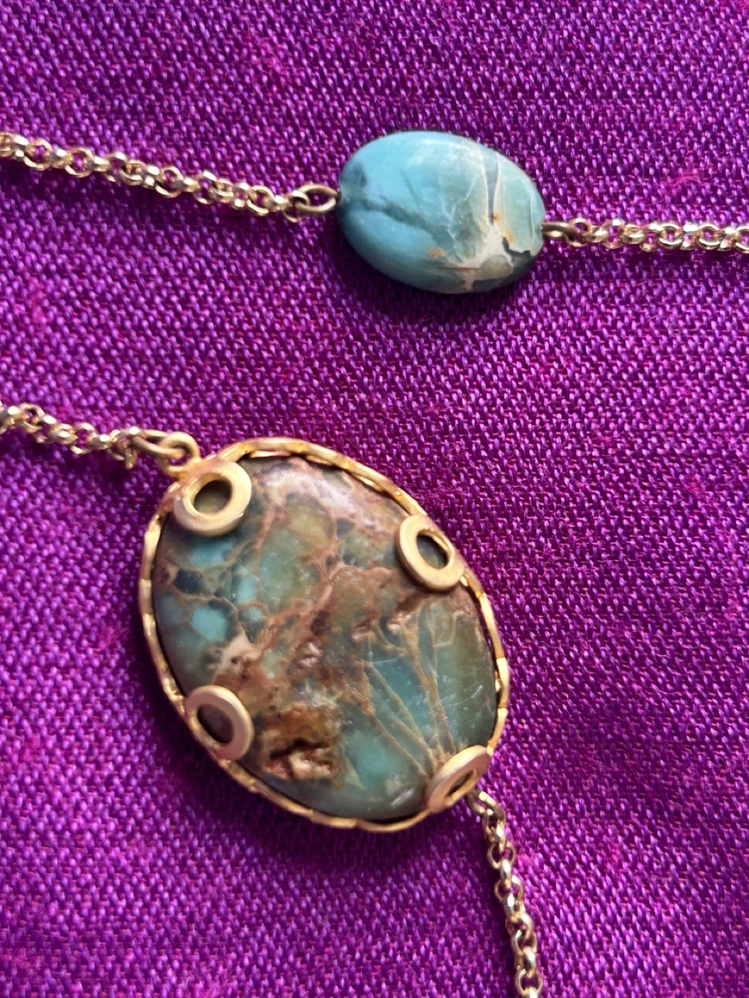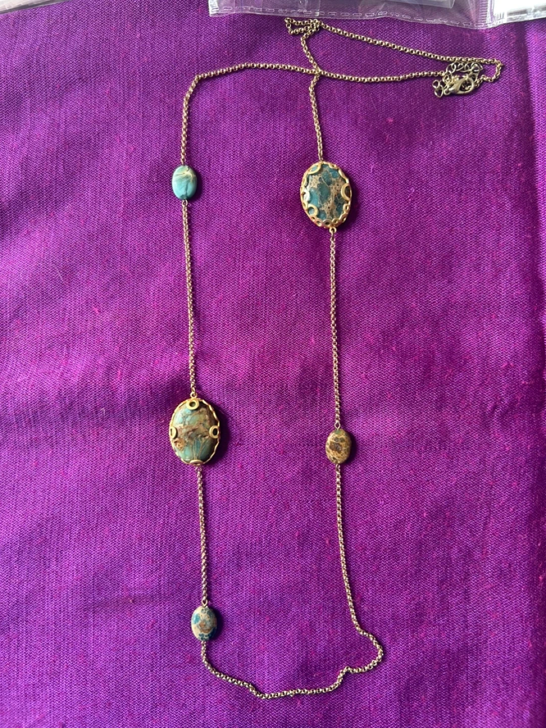 This is a beautiful boho style necklace featuring turquoise and gold tone accents. It's perfect for adding a unique touch to any outfit!