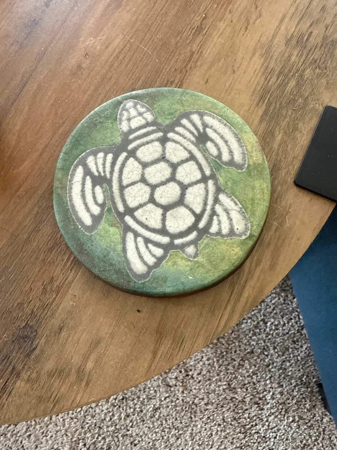 Here's a cute ceramic coaster with a turtle design! It has a green background and a white turtle. Perfect for protecting your furniture!