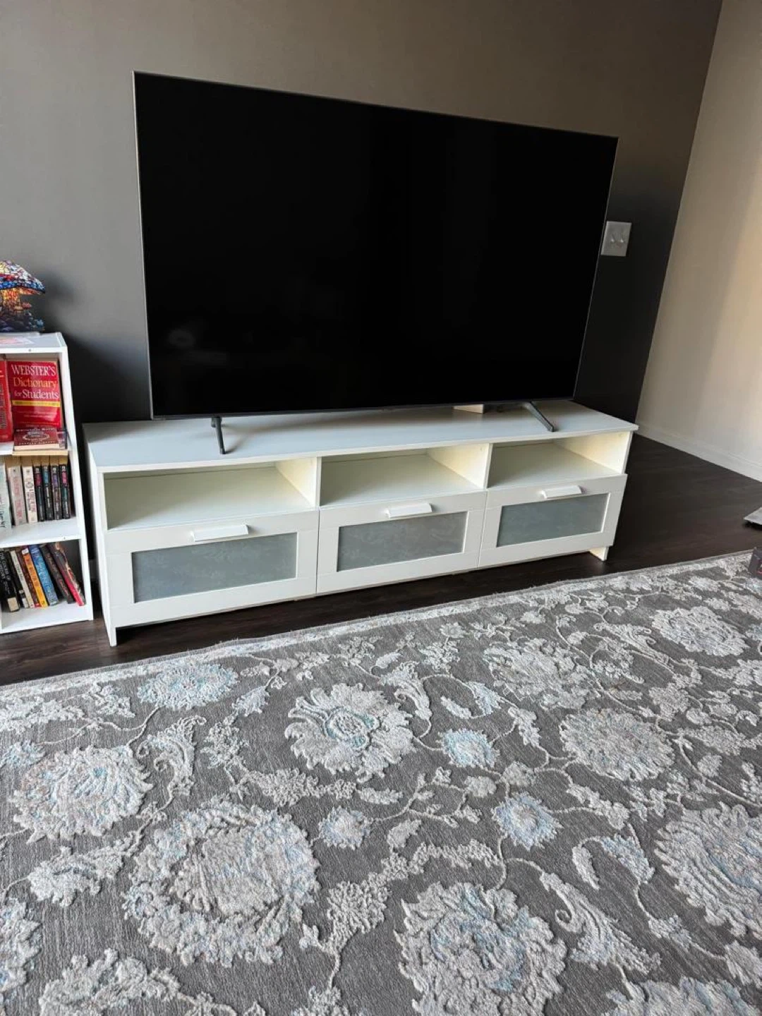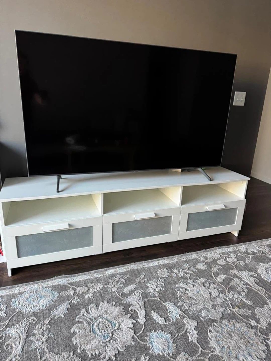 Selling a white tv stand and TV in great condition! It features a clean design with plenty of storage space for your media devices and accessories. Perfect for organizing your living room or entertainment area. It's a stylish and functional piece of furniture! TV 300$ tv stand 100$