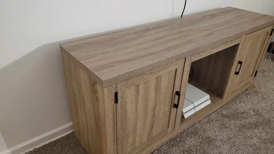 10TV stand in good condition! It's perfect for a living room or entertainment space. It has a neutral wood grain finish that would match most decor. It has two cabinets with doors and an open shelf in the middle for consoles or media players