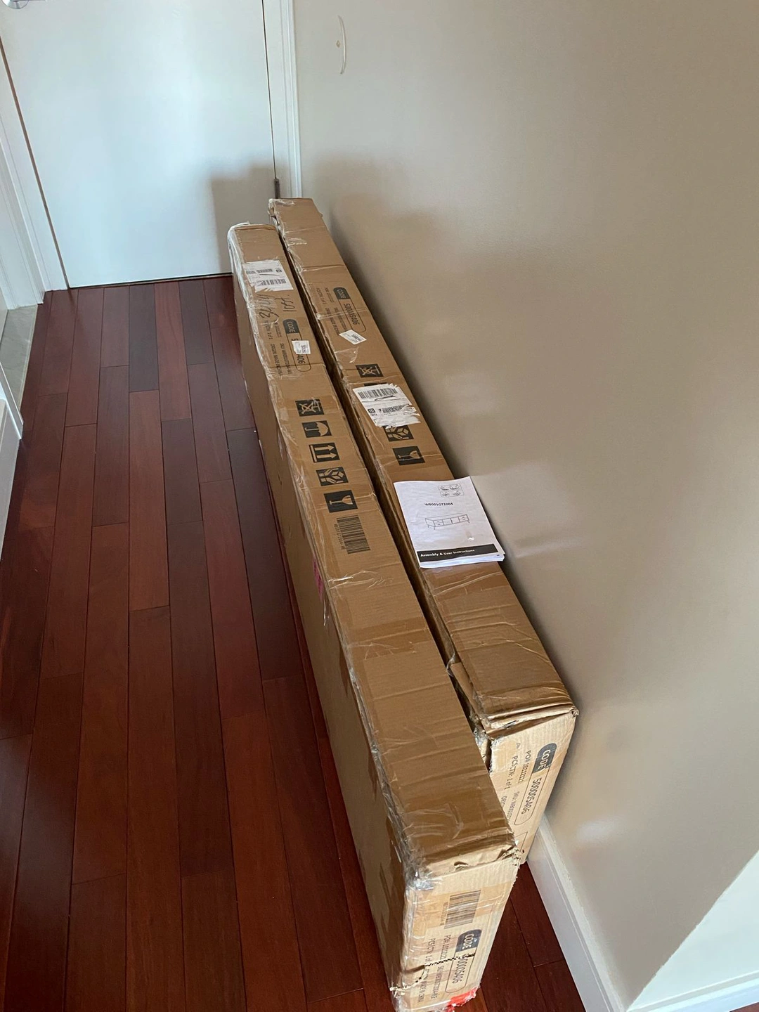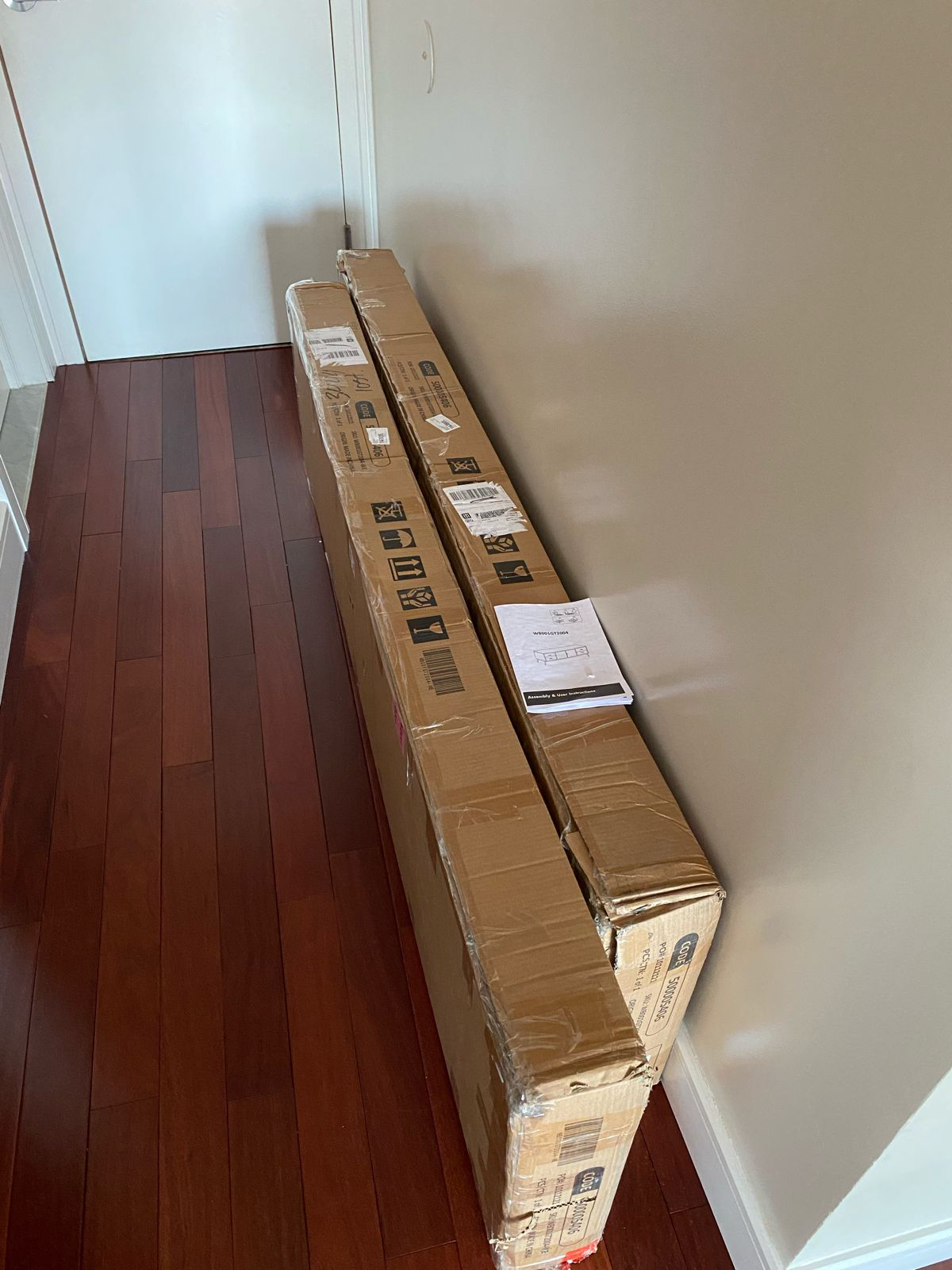 The item is new in it’s package box. But it has damaged 2 parts as shown in pictures . One of the damaged parts will not be seen after installing the table because it will be in the bottom. The other damaged part is on the right top back edge. The table is in 2 packages. The dimensions of Each package 75” x 20” x 6” Dimensions of the table are 69.3” W 20.47”H 15.75”D The original price of this item is $225 Color of the item (White with Marble Top . Golden legs, handles and frame) No shipping. Only pick up from Astoria, Queens, NY