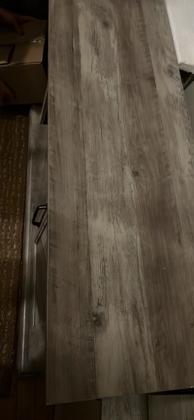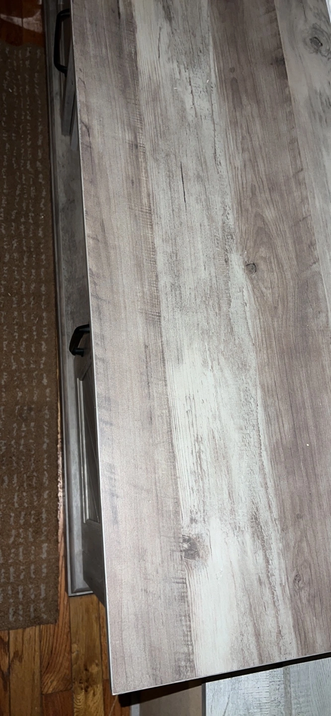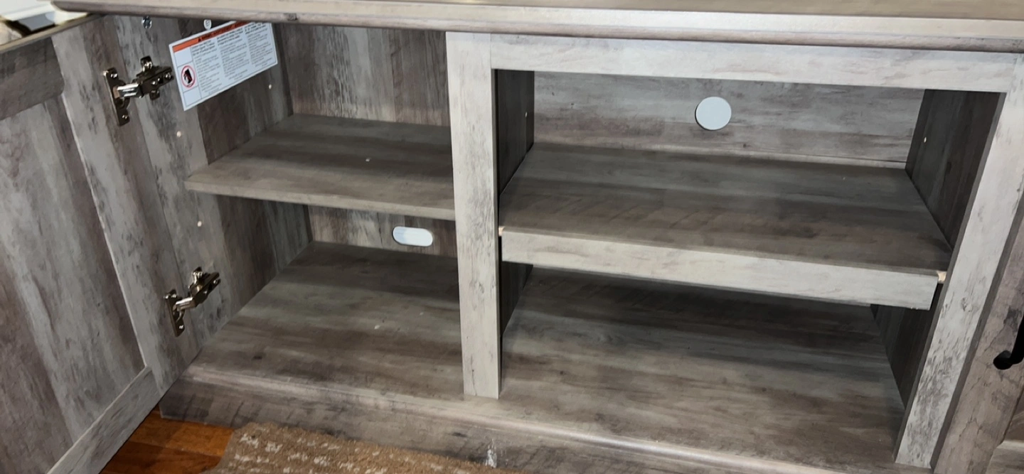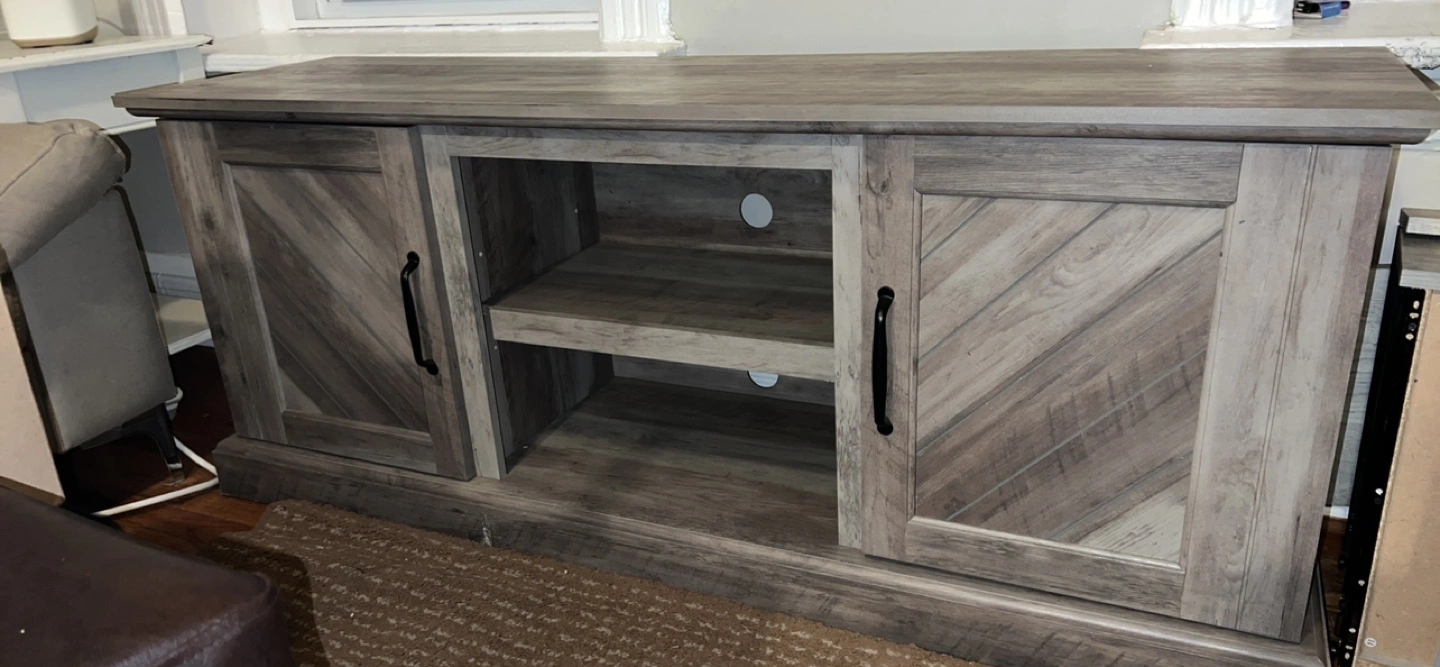 Gray wood-look TV stand. Two cabinet doors with shelves inside. Open shelving in the middle. Great for living room entertainment.