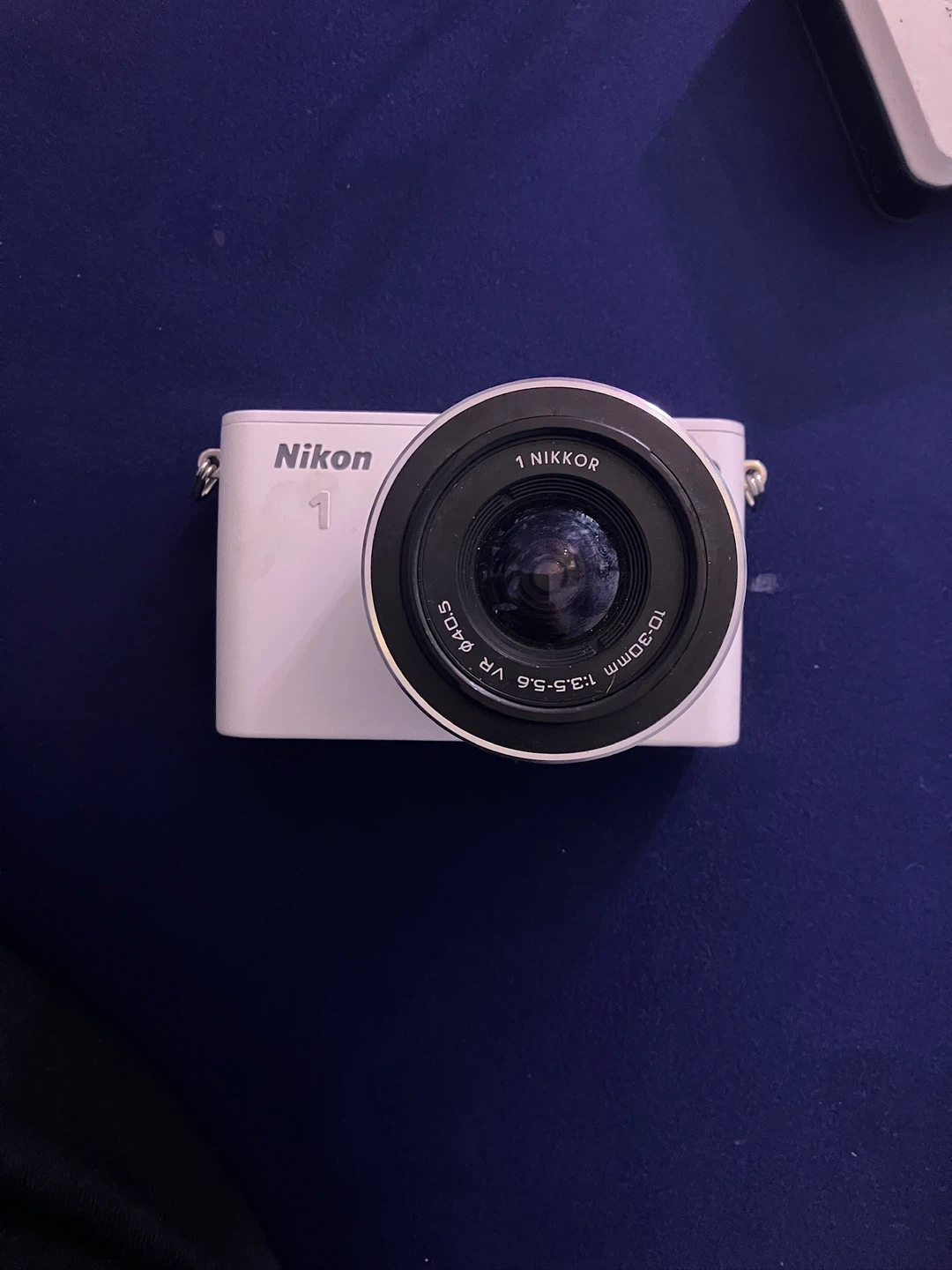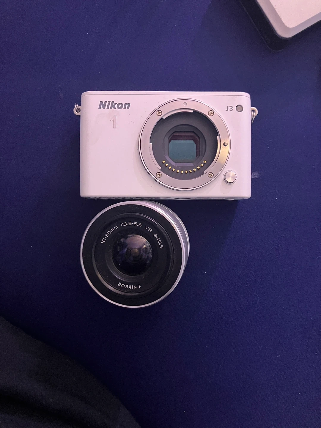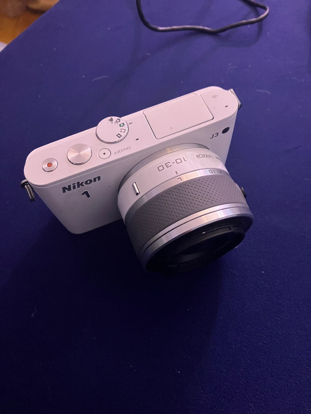 This is a white Nikon 1 J3 digital camera with a 1 NIKKOR 10-30mm lens. The camera body is white and it includes the lens. The lens offers a zoom range from 10-30mm with a variable aperture of f/3.5-5.6 and Vibration Reduction (VR).