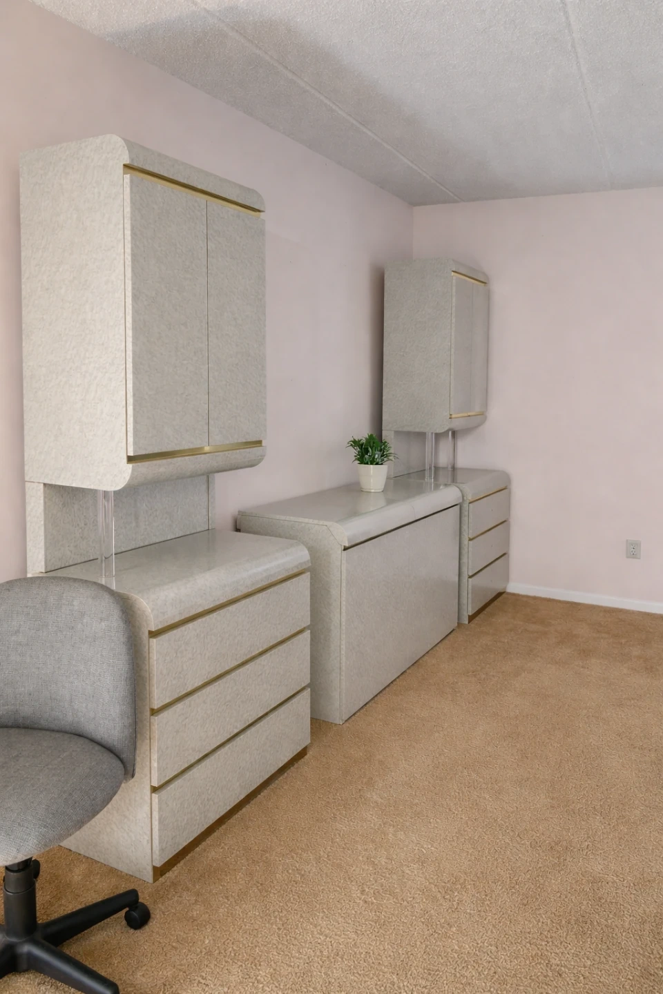 Unique textured vanity dresser set with a waterfall edge and gold trim. Includes a matching hutch and drawers for storage. The material appears to be laminate with a faux textured finish. It's a stylish piece from a past era! Middle one has lot of storage inside.