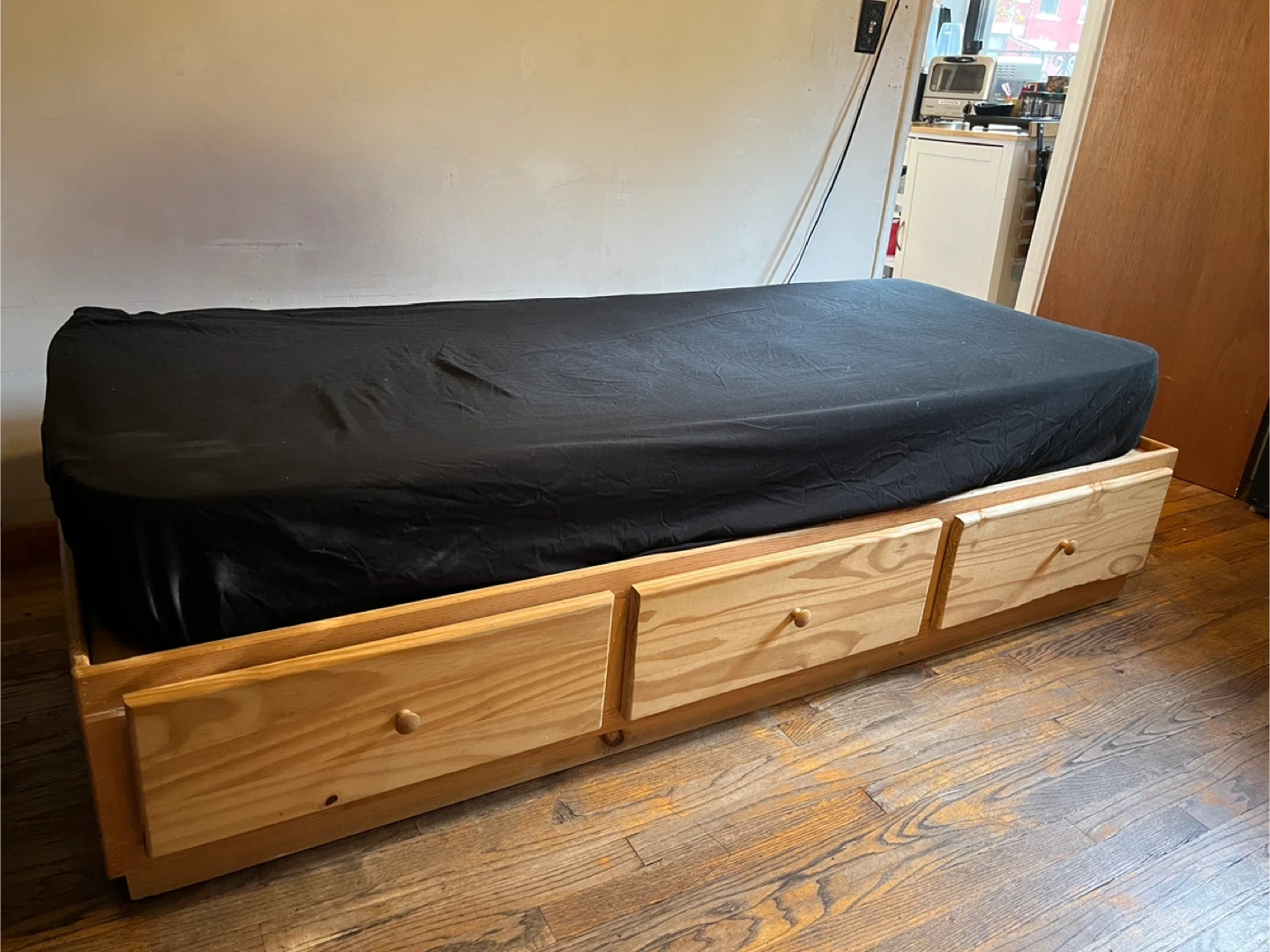 Selling a twin bed frame that comes with built-in storage drawers! It's a great way to maximize space in a smaller room. The frame is made of wood and has three spacious drawers on one side. Perfect for kids or guest rooms