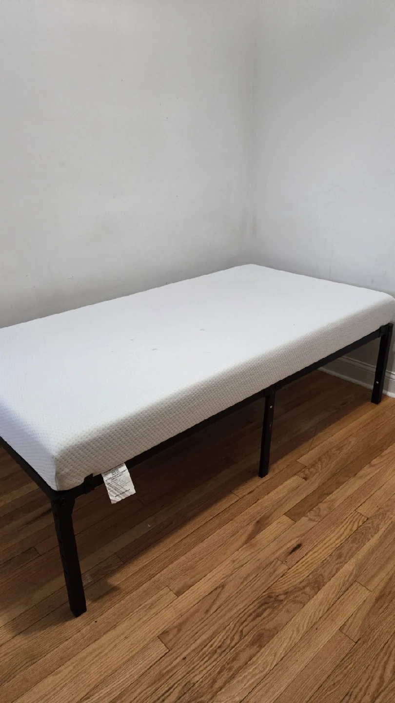 0Selling a twin mattress and metal bed frame. The mattress is white and has a textured surface. The bed frame is black metal. Great for a guest room or small space