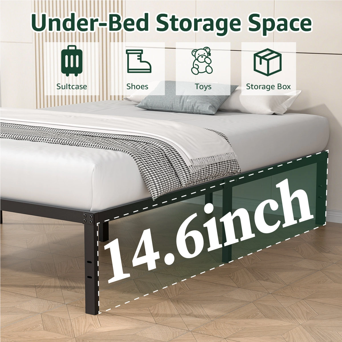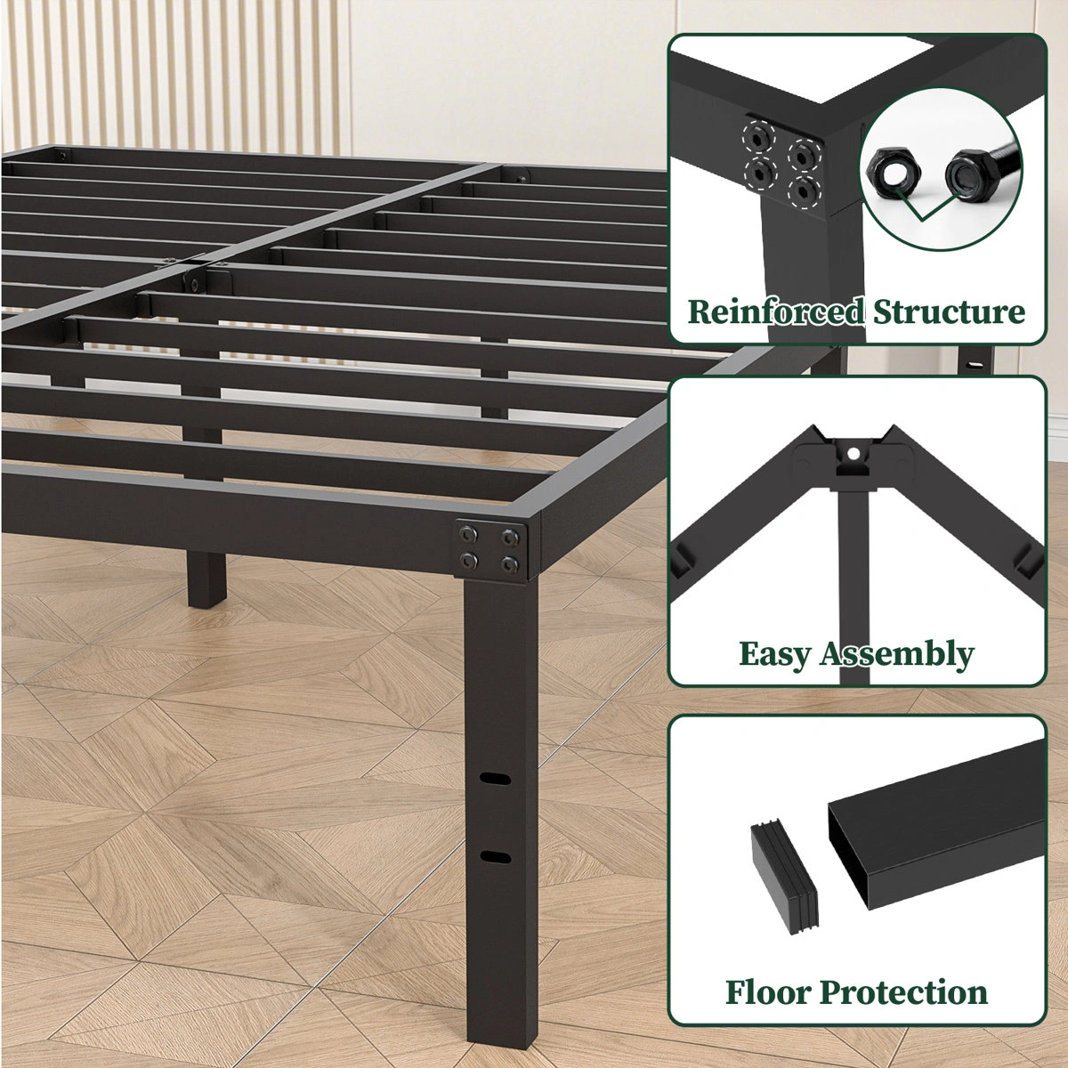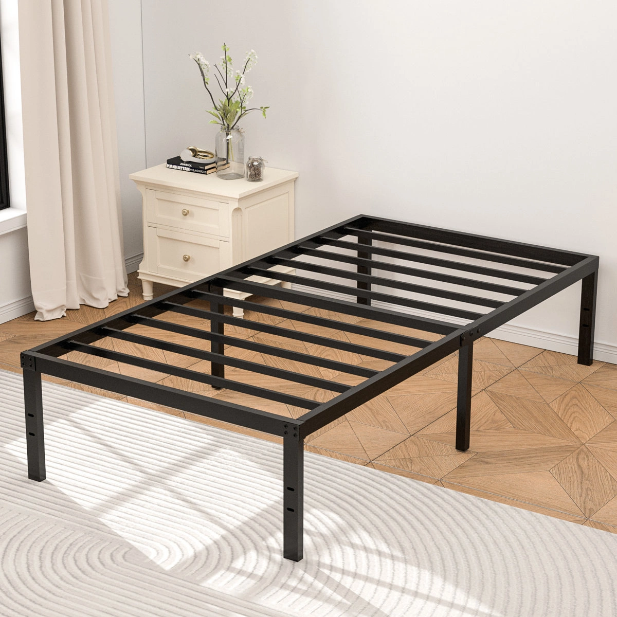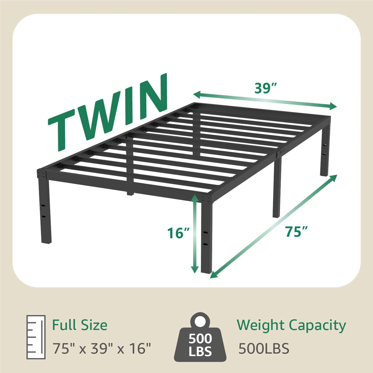 This is a twin size metal bed frame platform. It features: - Reinforced structure - Easy assembly - Floor protection The dimensions are 75" x 39" x 16". It has a weight capacity of 500 lbs. It also has under-bed storage space.