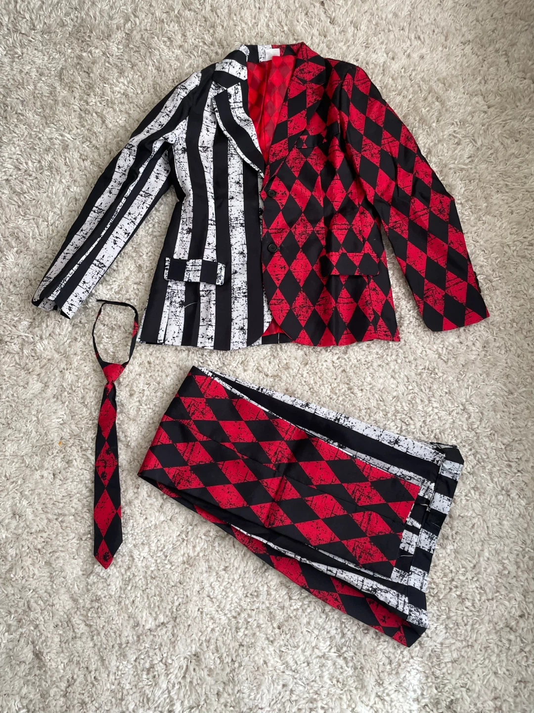 495Spirit Halloween Twisted Circus Suit! This includes the jacket, pants, and tie. The size is a child's large (12-14). It features a unique half-and-half design with black and white stripes on one side and red and black diamonds on the other
