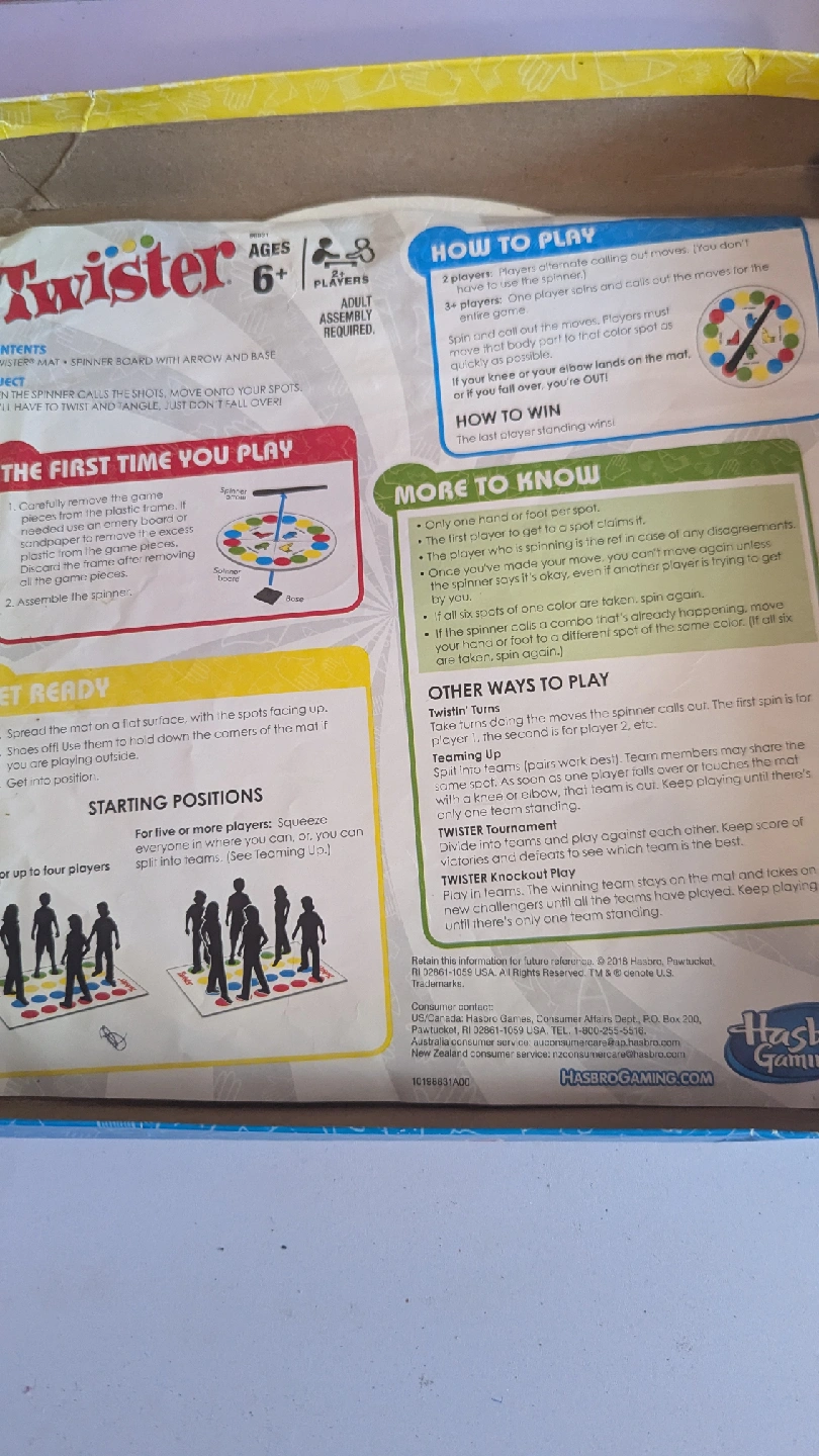 113Get ready to tie yourself up in knots with this classic Twister game! It's the perfect activity for 2+ players and great for ages 6 and up. Includes the Twister mat, spinner board with arrow, and base. Get ready to twist and tangle!