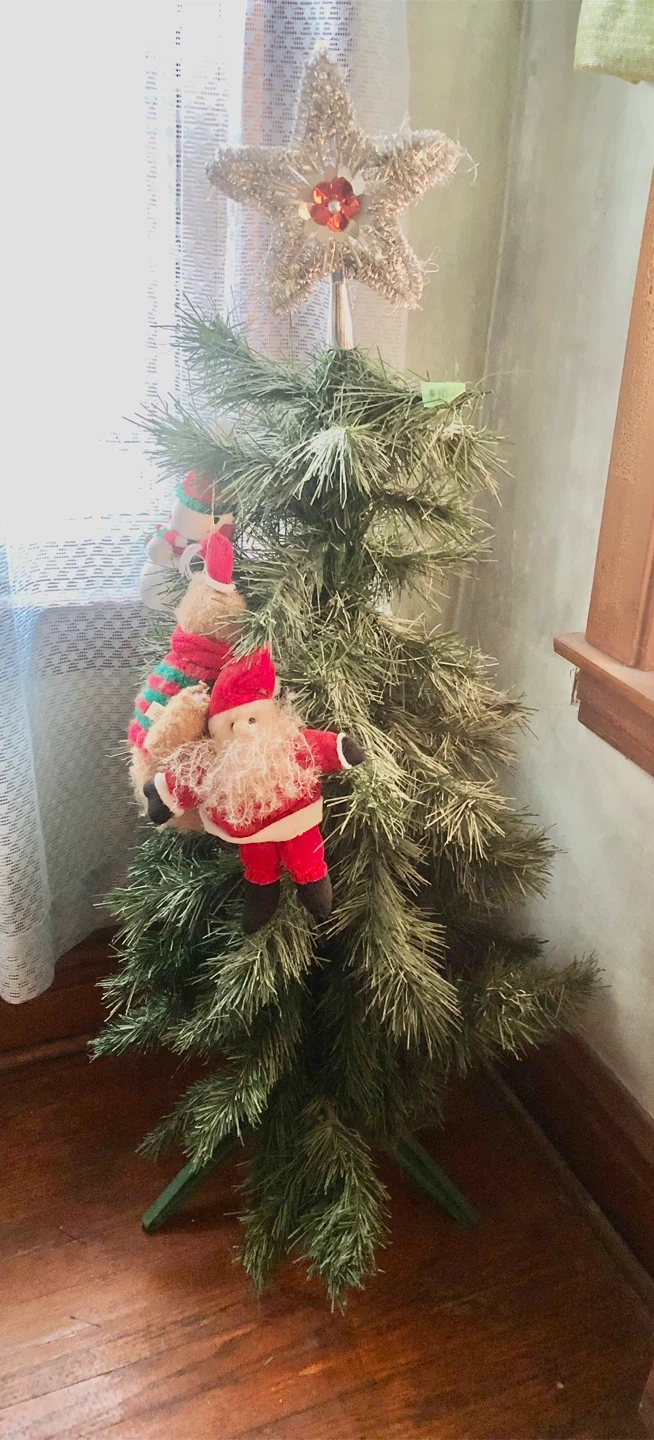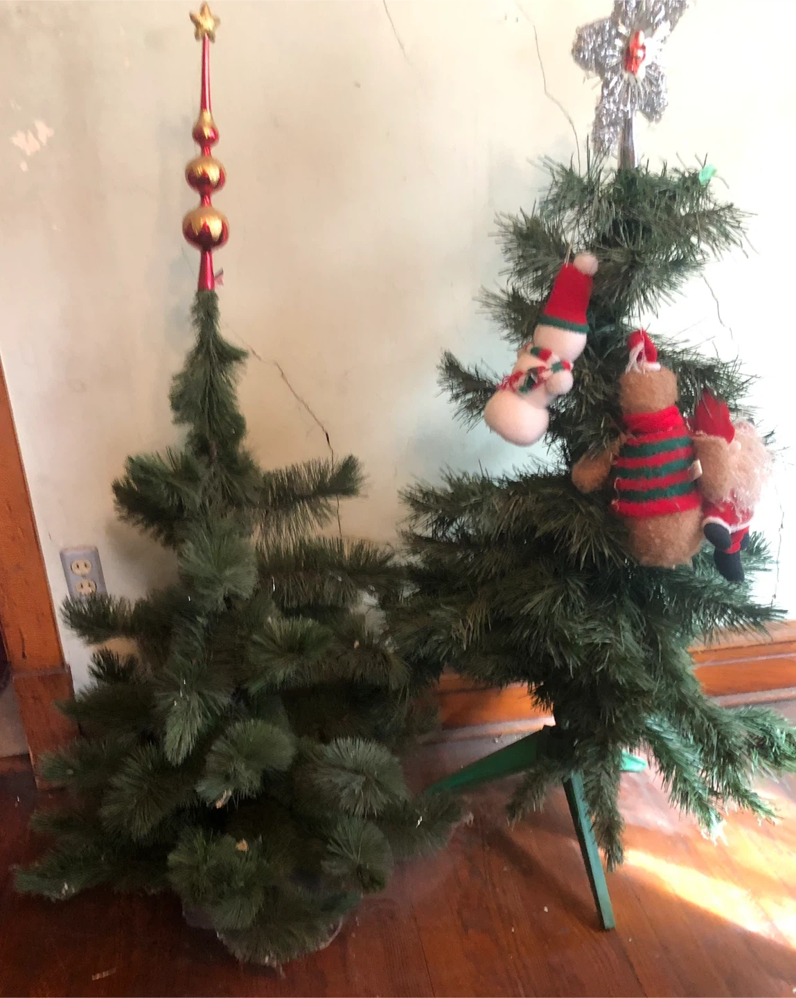 95Selling two artificial Christmas trees. One is decorated with a star and several plush ornaments. The other is decorated with a star and red and gold ornaments. One is 44 inches tall and the other is 41 inches tall without the tree top decoration. One has a heavy wood on it so it would be fine outside. You can have the decorations if you want them. My relative loved Christmas she had three Christmas trees up year round. She decorated them differently for each season. $20 is for both. May only be available until Tuesday