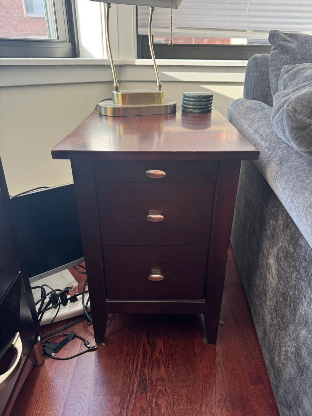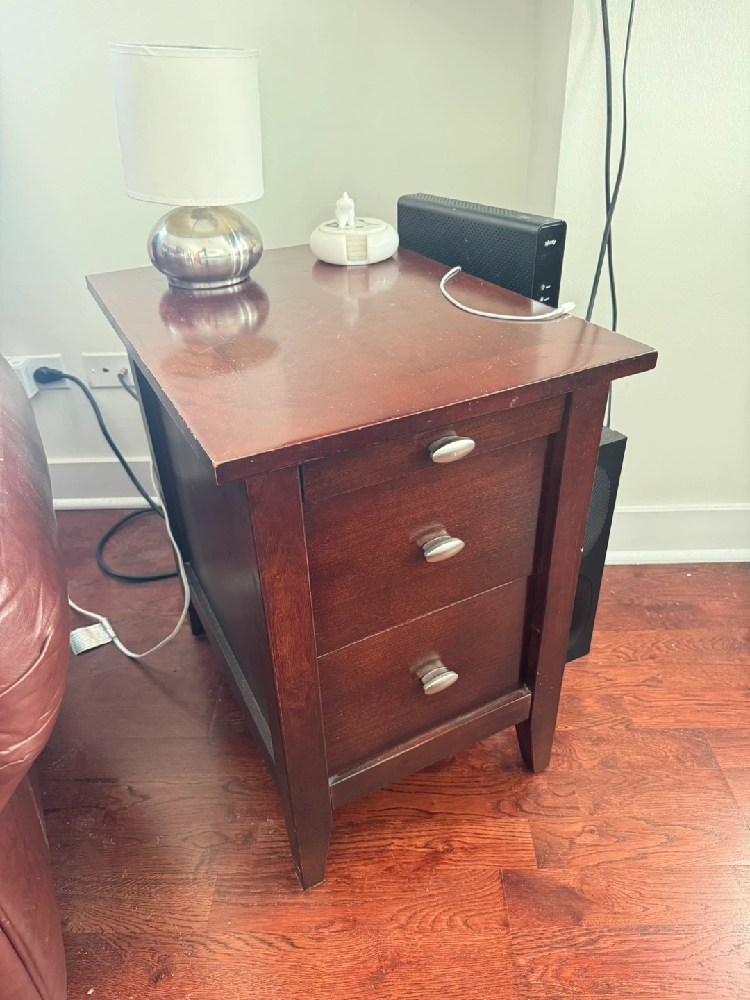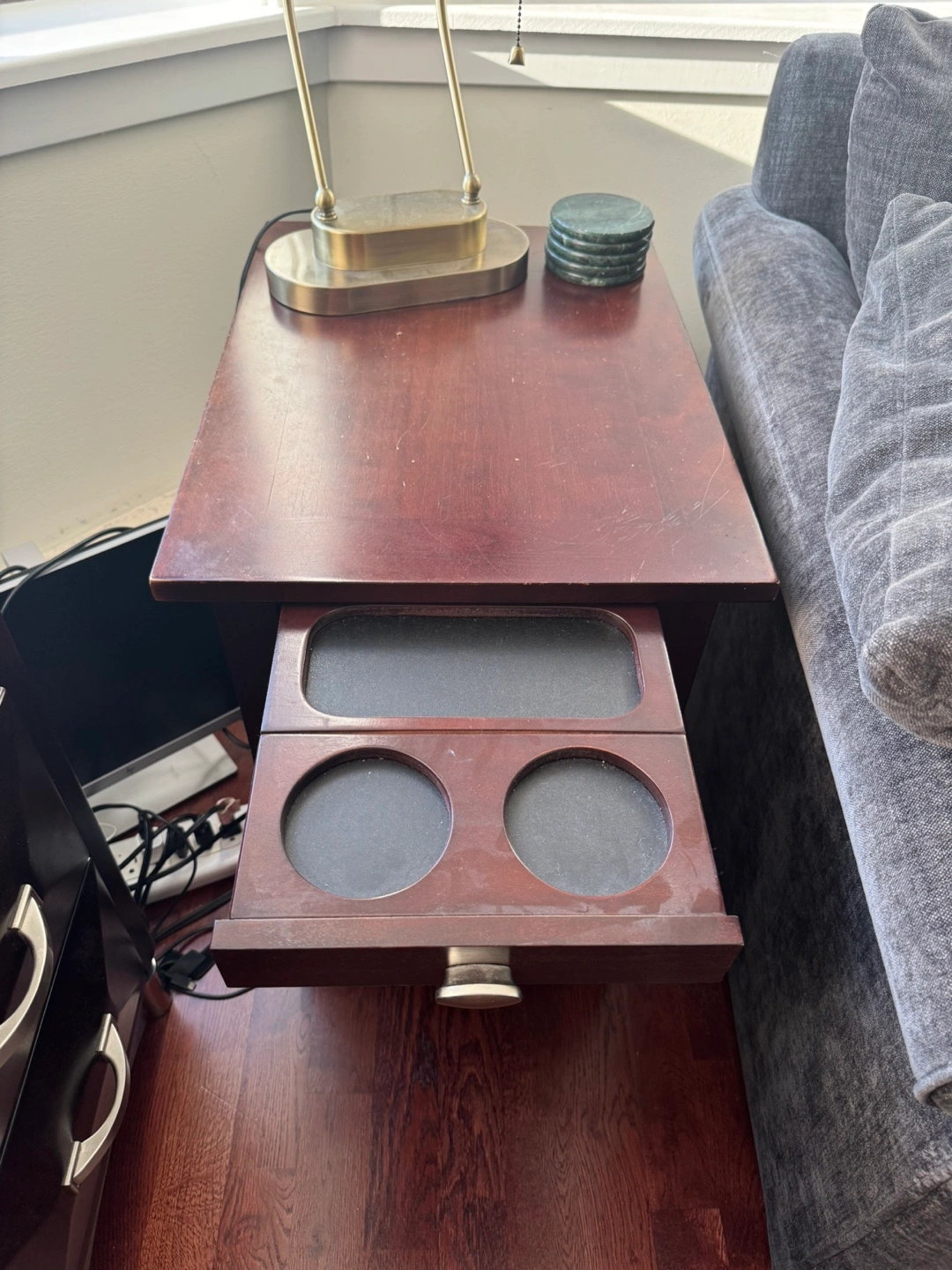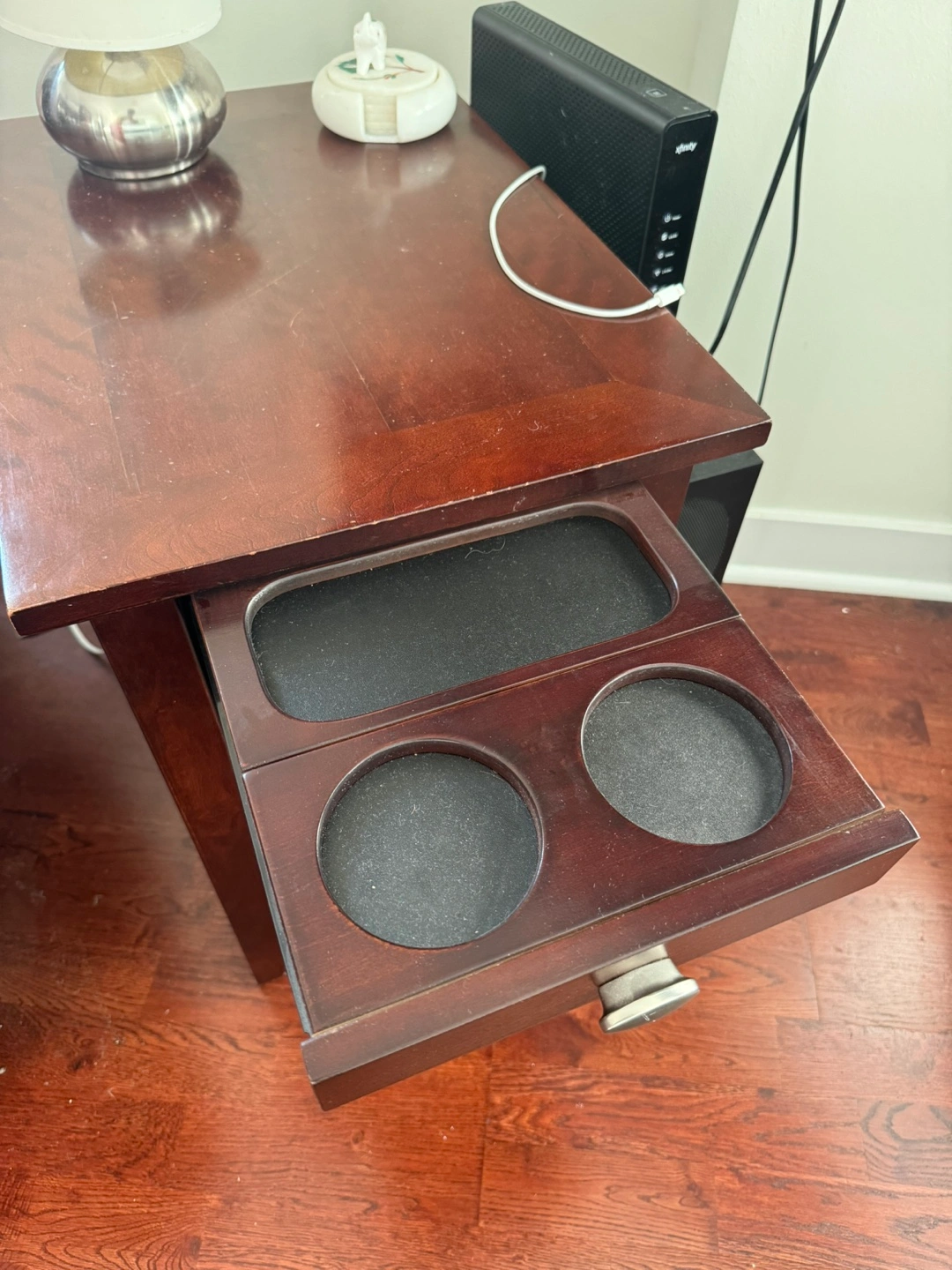 15These are brown wood side tables with a drawer. The drawer has a unique design with circular cutouts and a rectangular space. It's a great piece to add to your bedroom or living room!