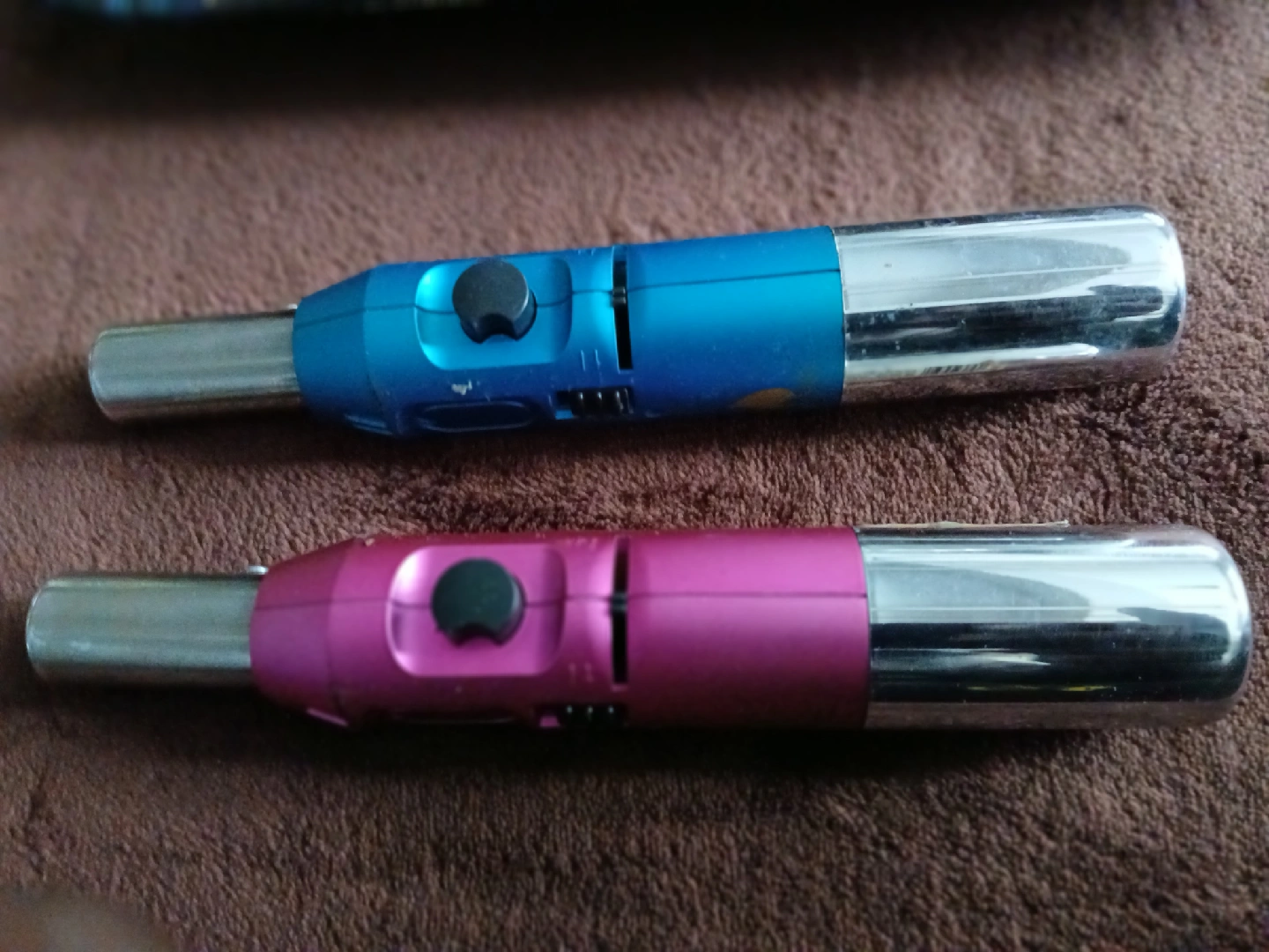 Selling two culinary torch lighters, one in blue and one in pink. They're perfect for kitchen use or for lighting candles. They appear to be in good condition and ready for a new home!