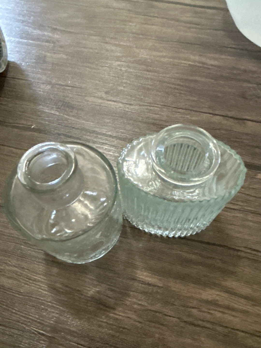 Two decorative glass bottles for sale! One has a floral design and the other has a ribbed design. They're in great condition and ready to add a touch of charm to your space