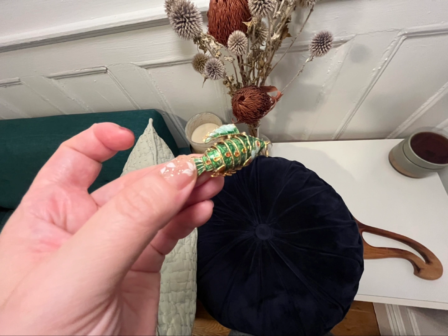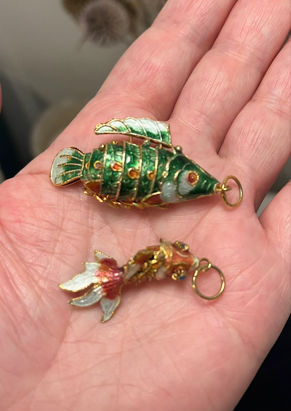 Pair of cloisonné fish charms. One green, one pink and white. Gold accents. Small and lightweight. Perfect for jewelry / necklaces or adding to a collection.