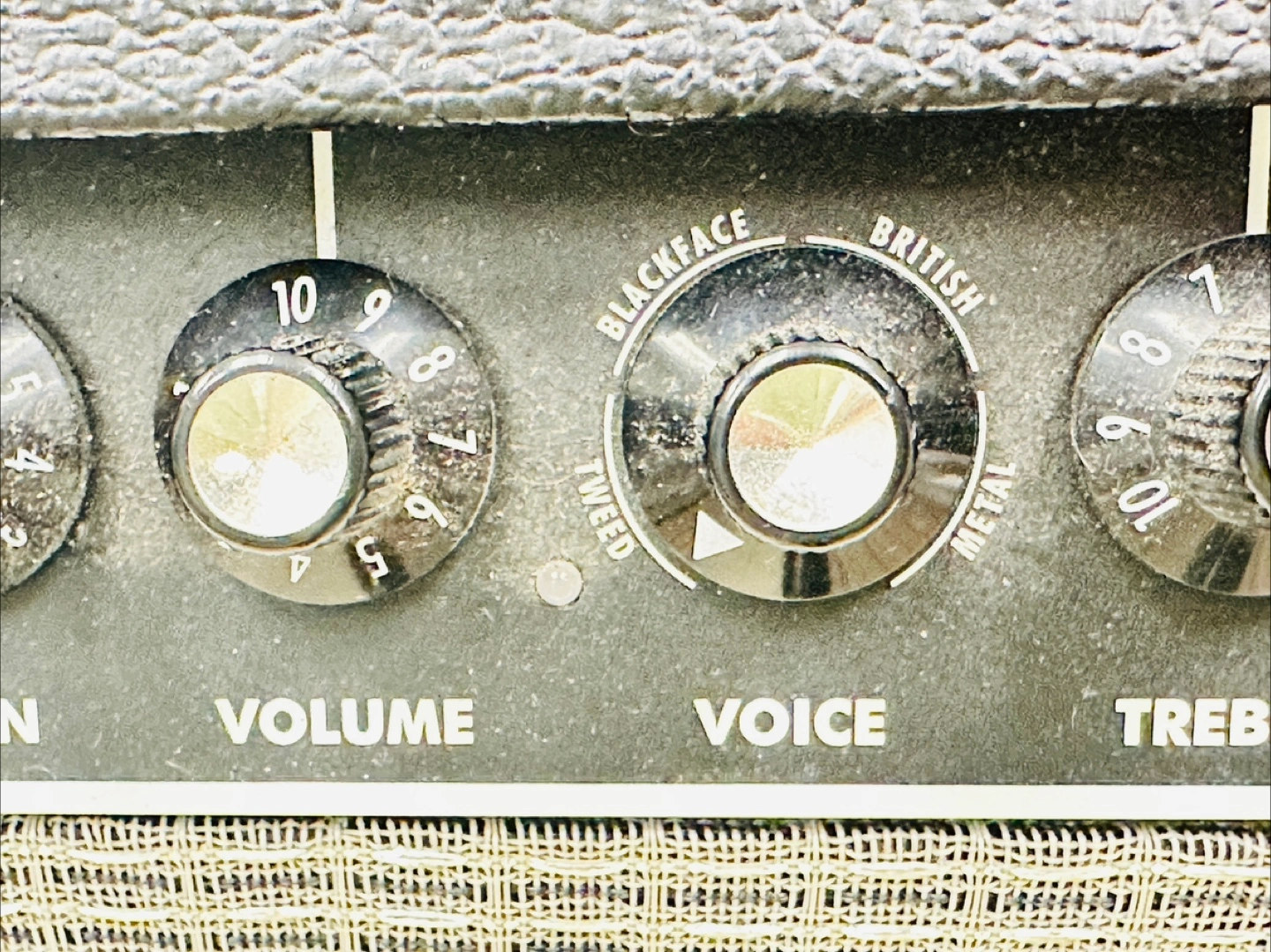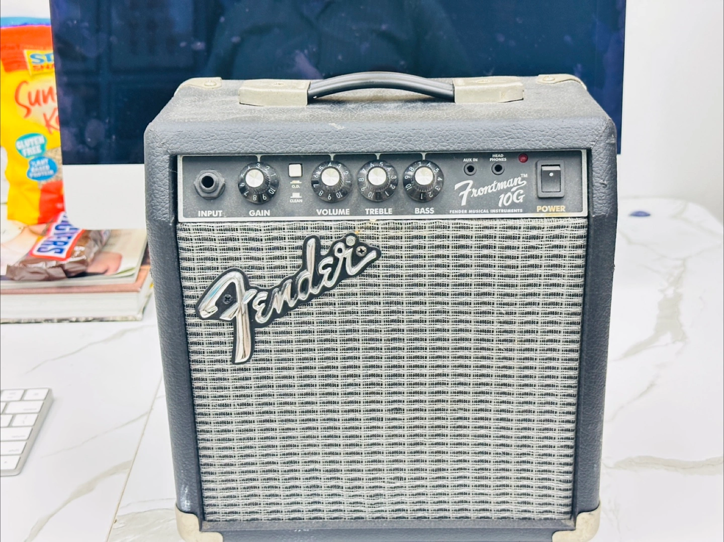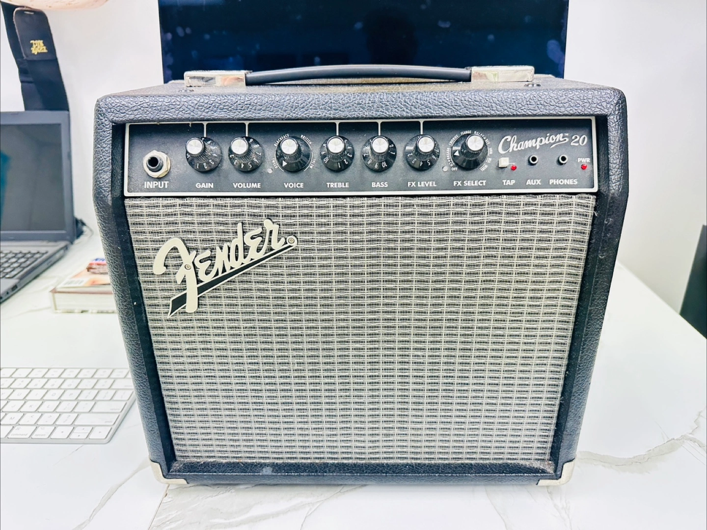 The amp includes various controls such as gain, volume, voice, treble, bass, FX level, and FX select. It features a classic Fender logo and speaker grille. An excellent choice for anyone wanting to play music.