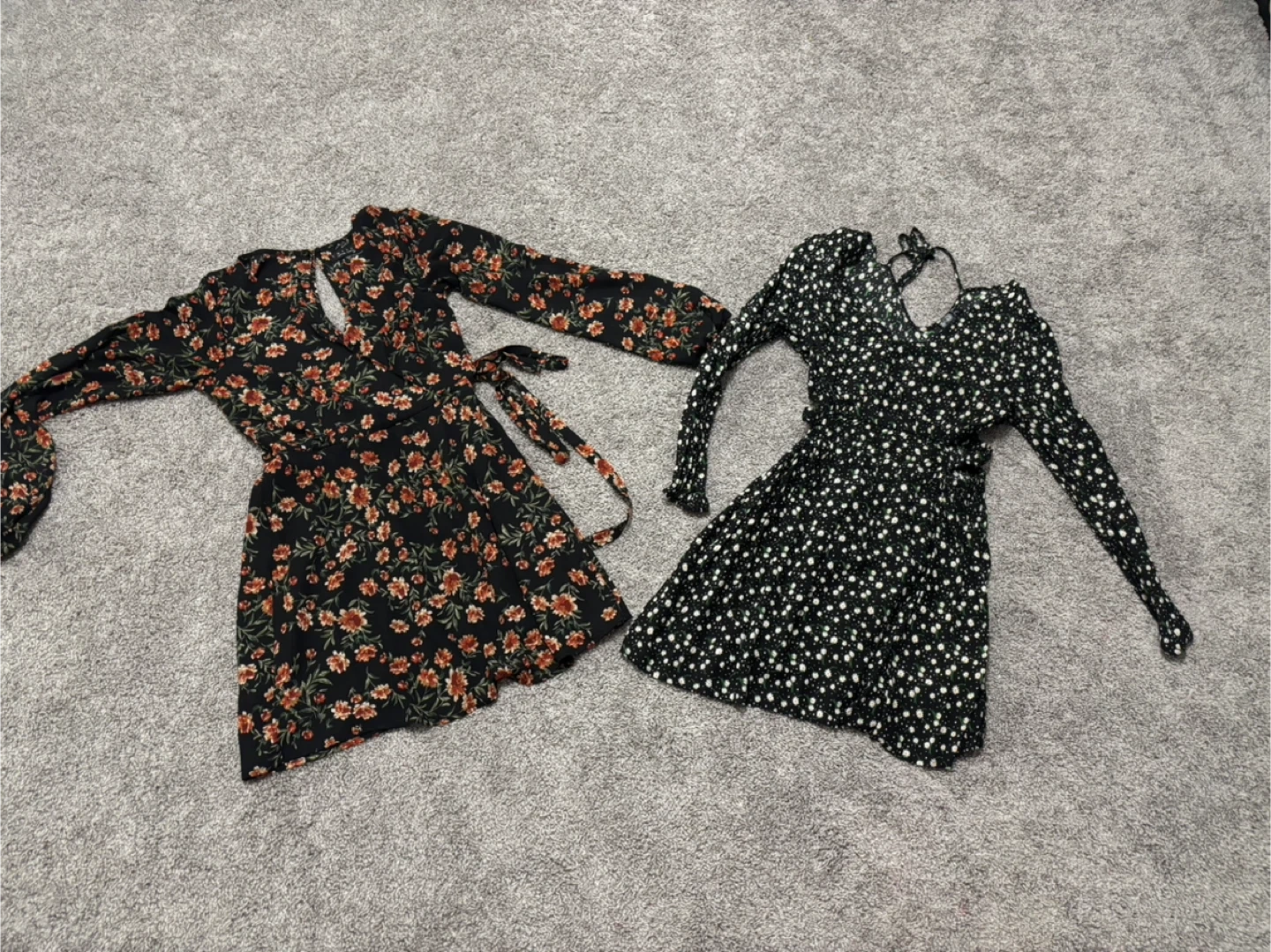 Here are two cute floral print dresses! One is a black dress with a red and orange floral pattern, and the other is a black dress with a white polka dot pattern. Both are in great condition and ready for a new home