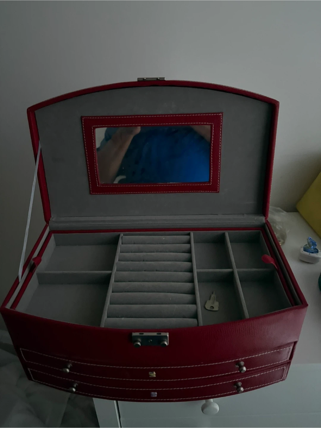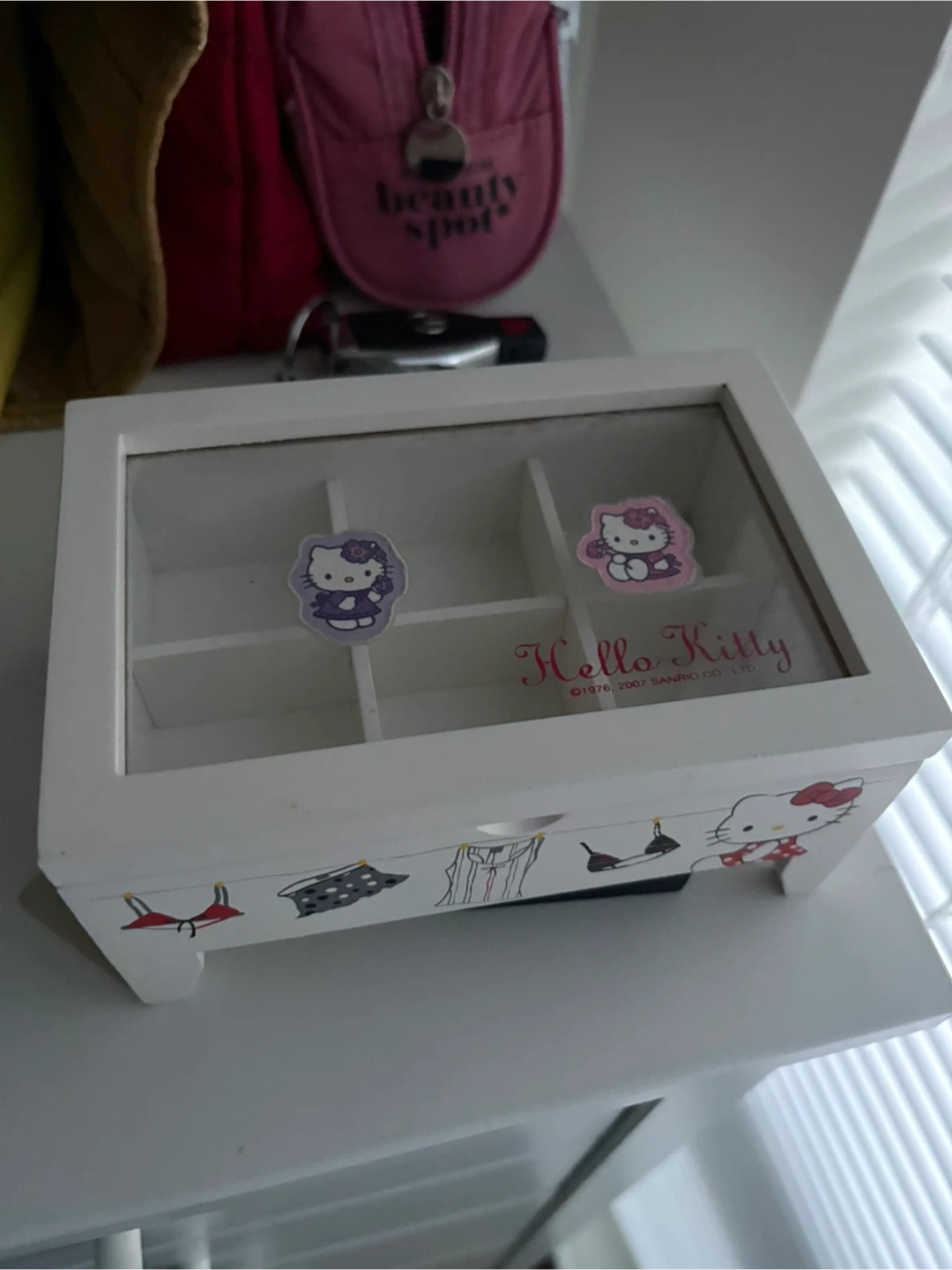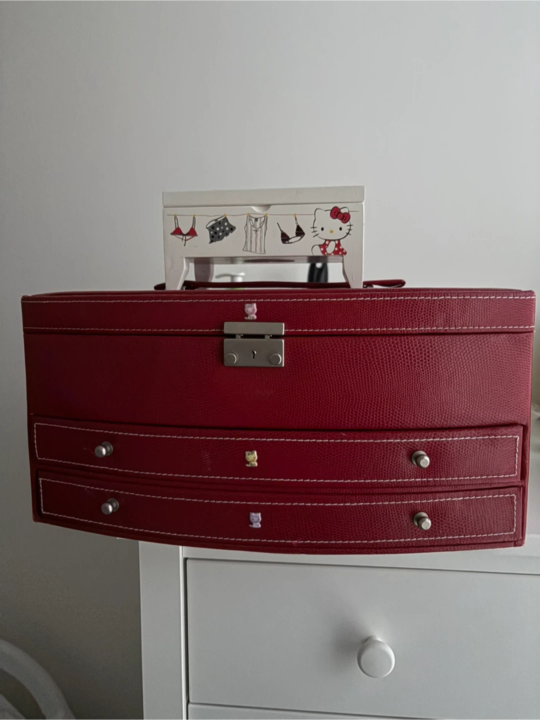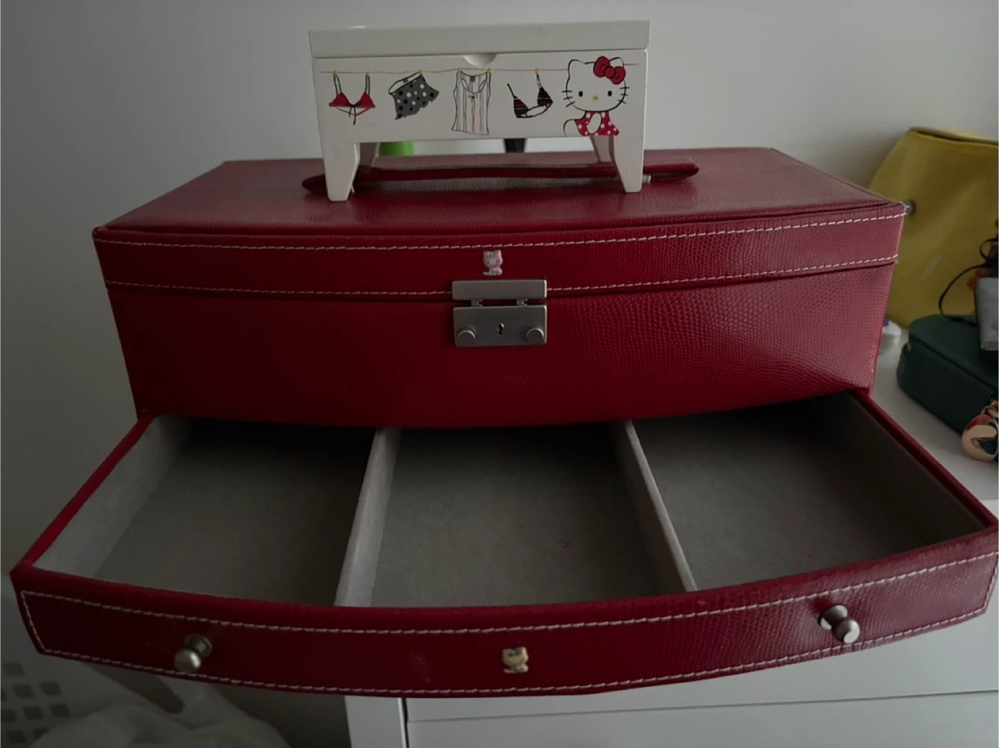Two jewelry boxes for sale. One large box with multiple compartments and a mirror. One small, Hello Kitty Box. Price includes both boxes.