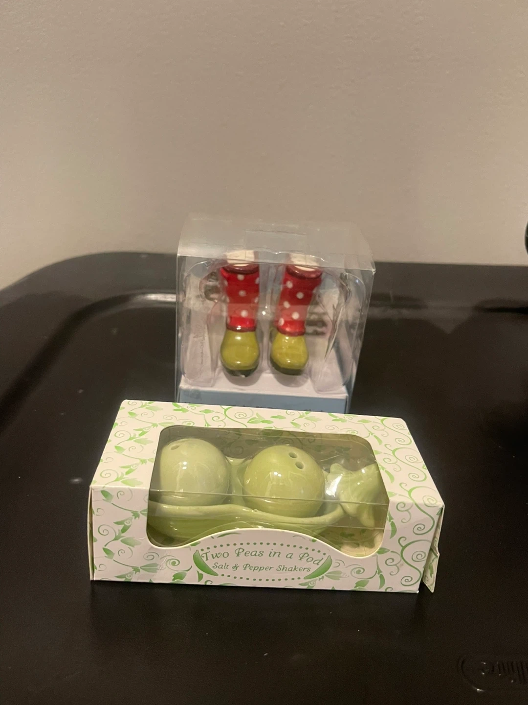 I have two sets of salt and pepper shakers for sale. One is a set of two peas in a pod, and the other is a pair of peas with red and white polka dot hats. They are both new in their original packaging!