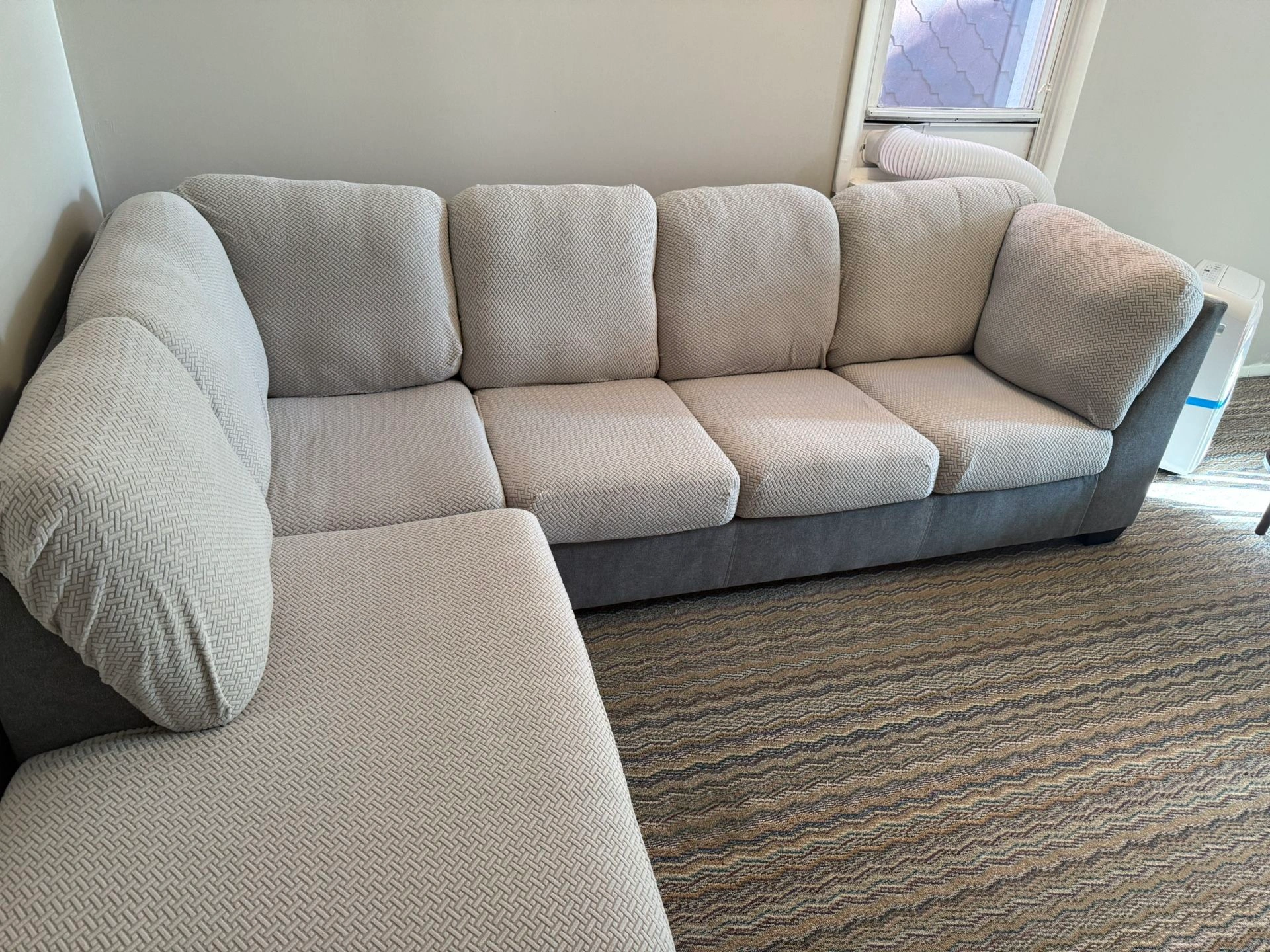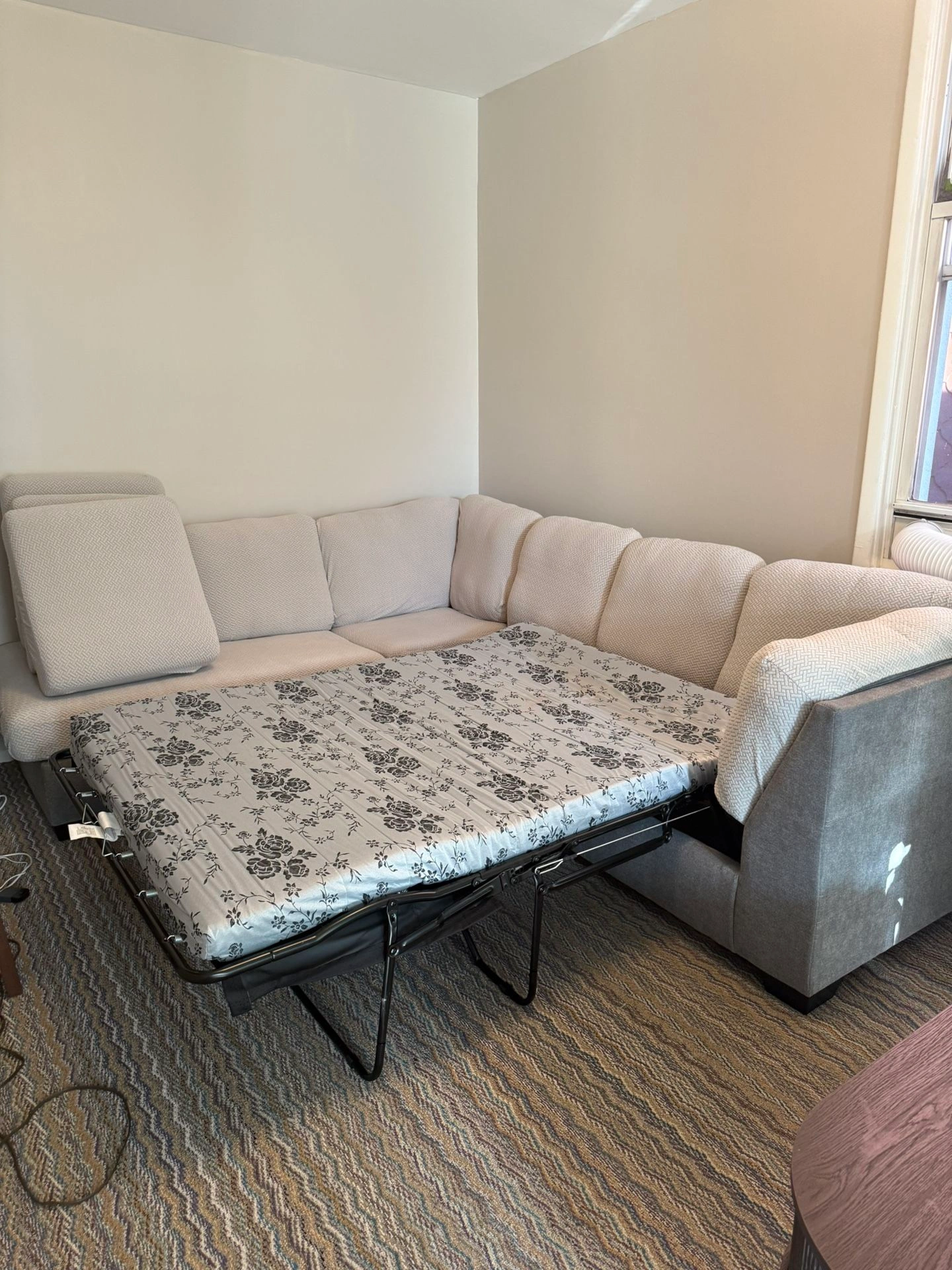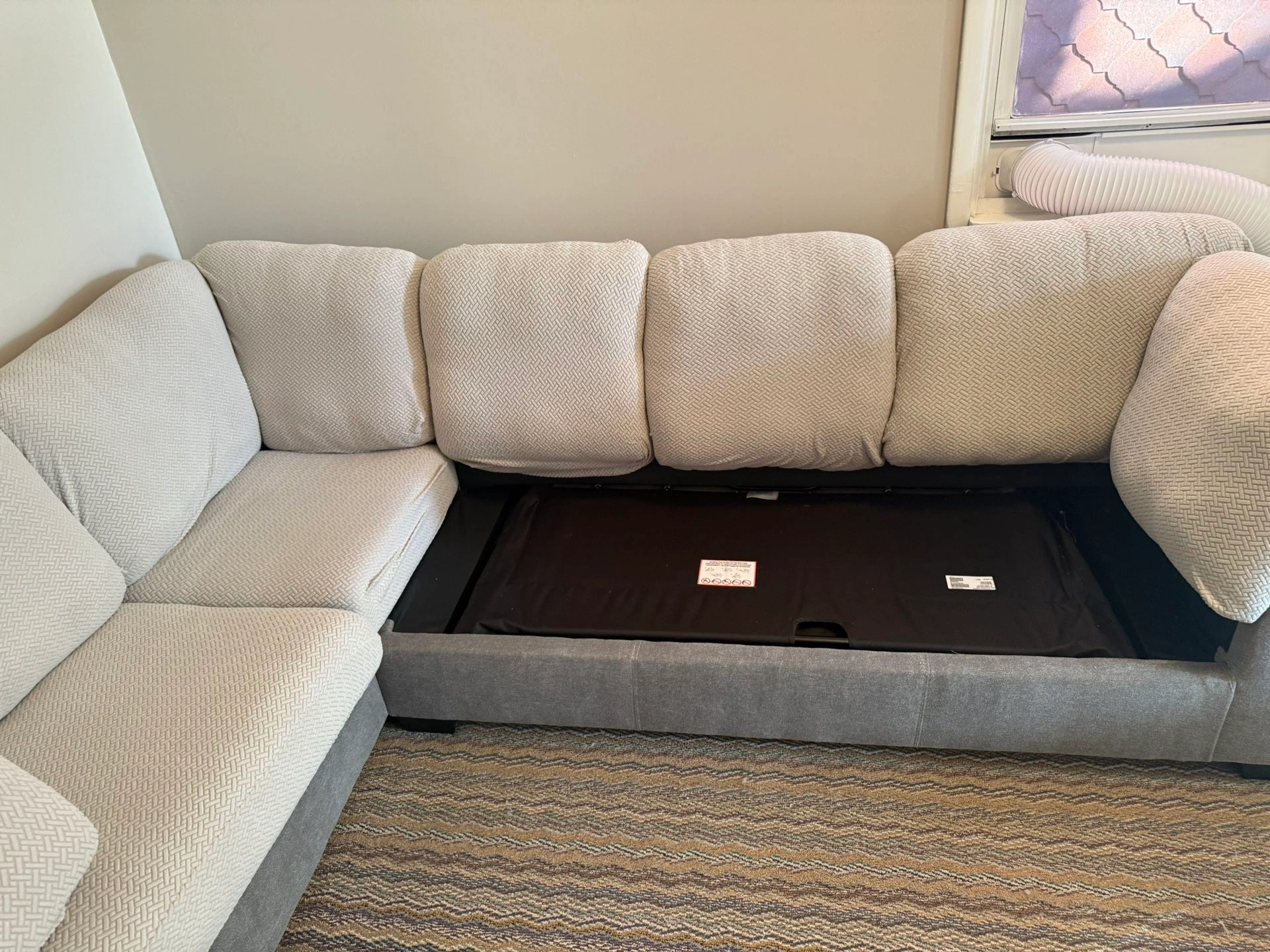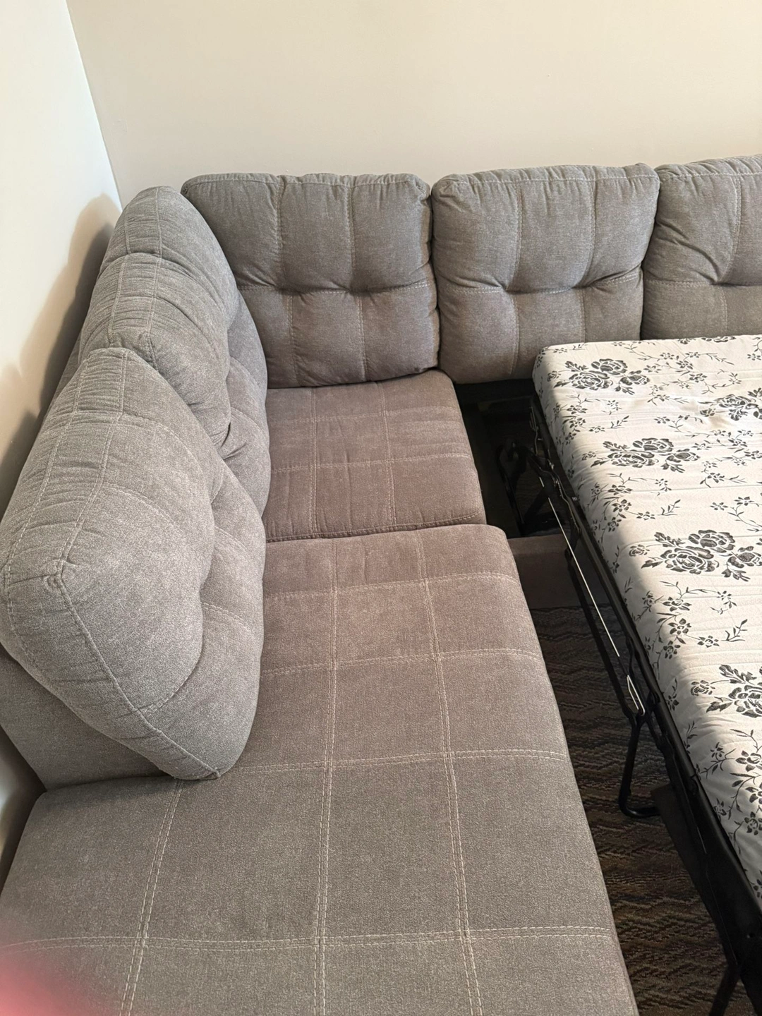 60L-Shaped Sectional Sofa W/ Sleeper in Gray. Plus free coffee table if you like. Bought 4 months ago. Super comfortable! Honestly we love this couch, problem is it’s to big for our narrow living room. We barely ever used it. Comes with covers. Free coffee table is from Walmart - Linsy home fluted coffee table Color: Gray Seating Capacity: More than 6