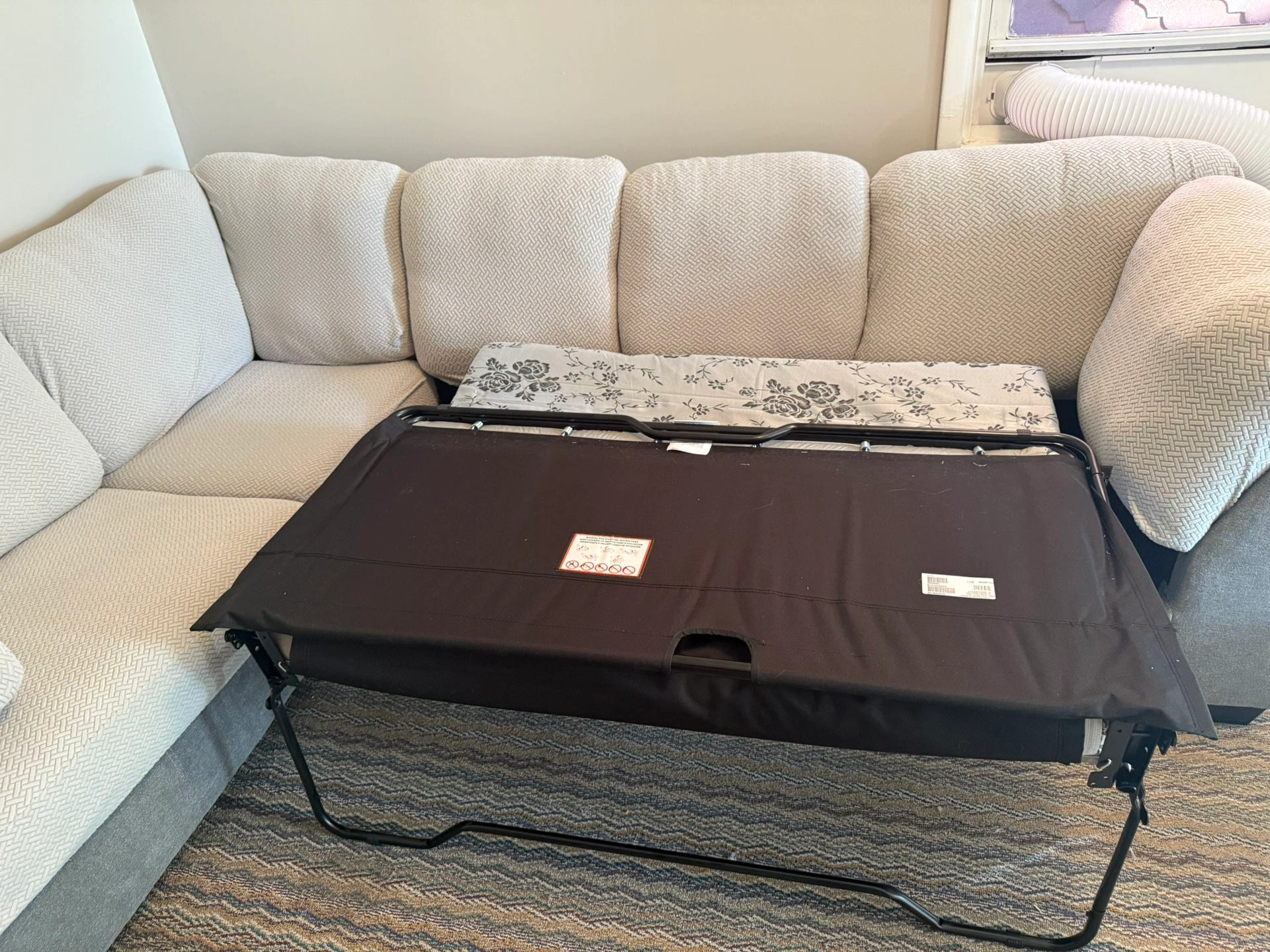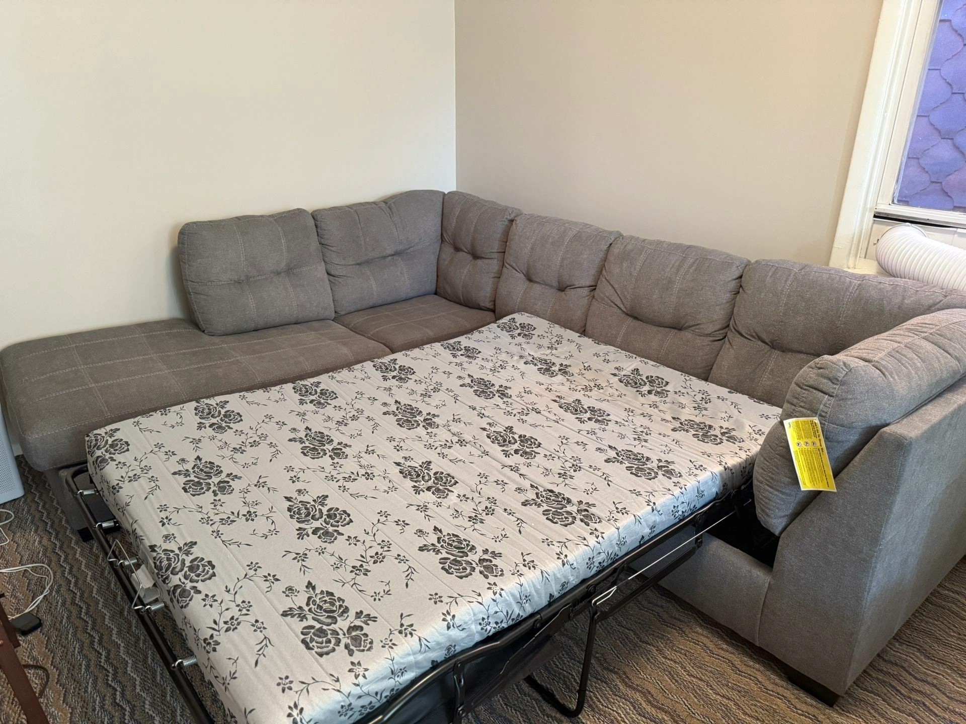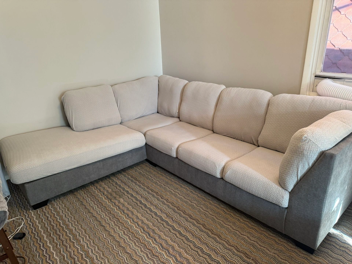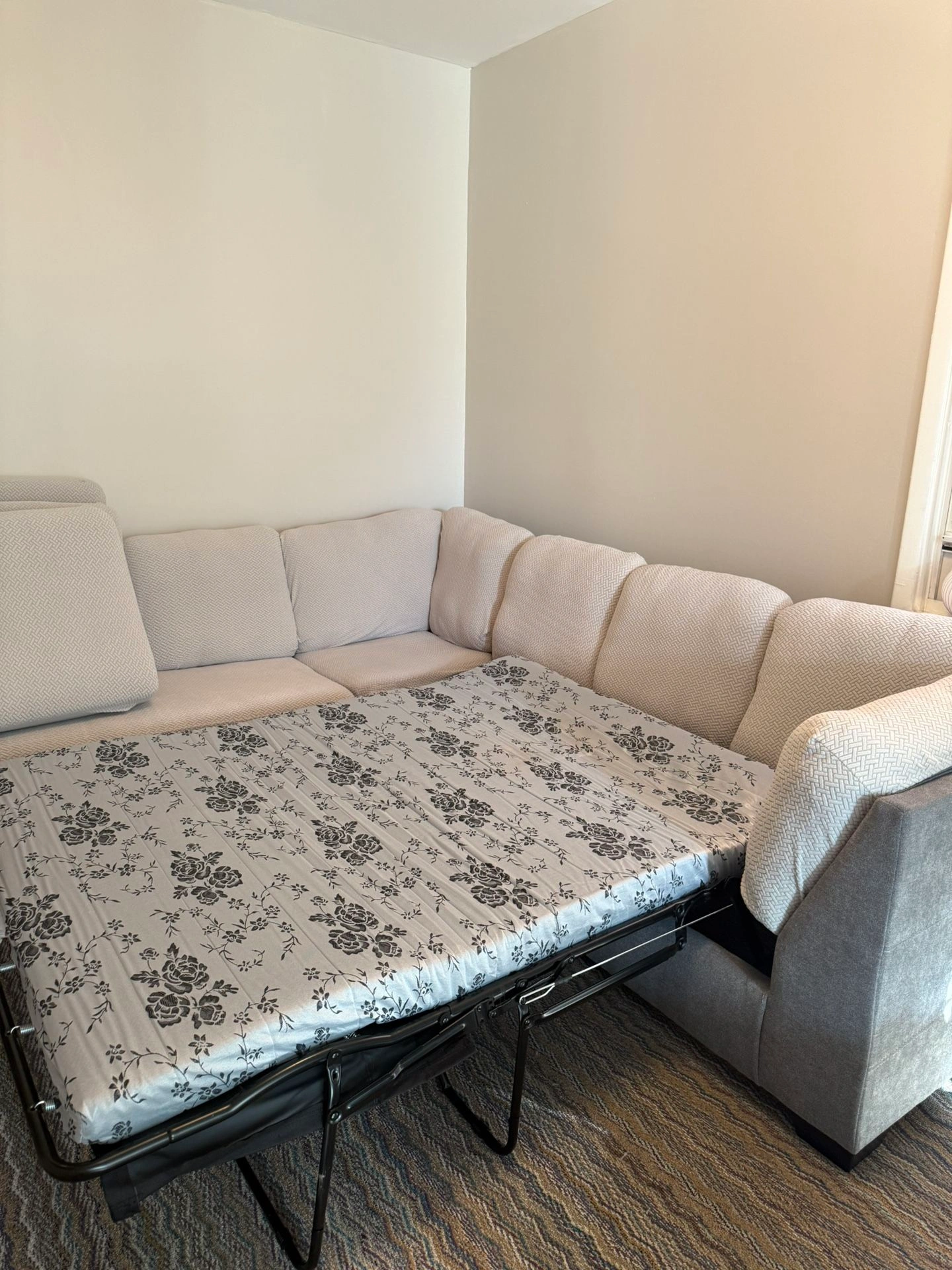 60L-Shaped Sectional Sofa W/ Sleeper in Gray. Plus free coffee table if you like. Bought 4 months ago. Super comfortable! Honestly we love this couch, problem is it’s to big for our narrow living room. We barely ever used it. Comes with covers. Free coffee table is from Walmart - Linsy home fluted coffee table Color: Gray Seating Capacity: More than 6