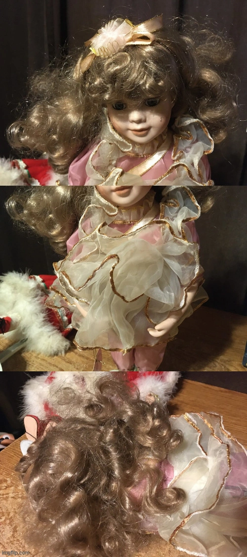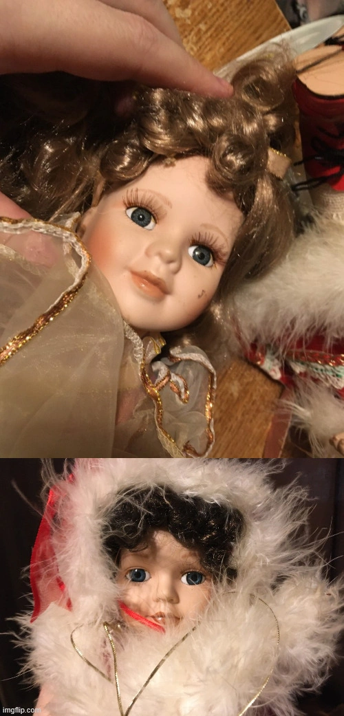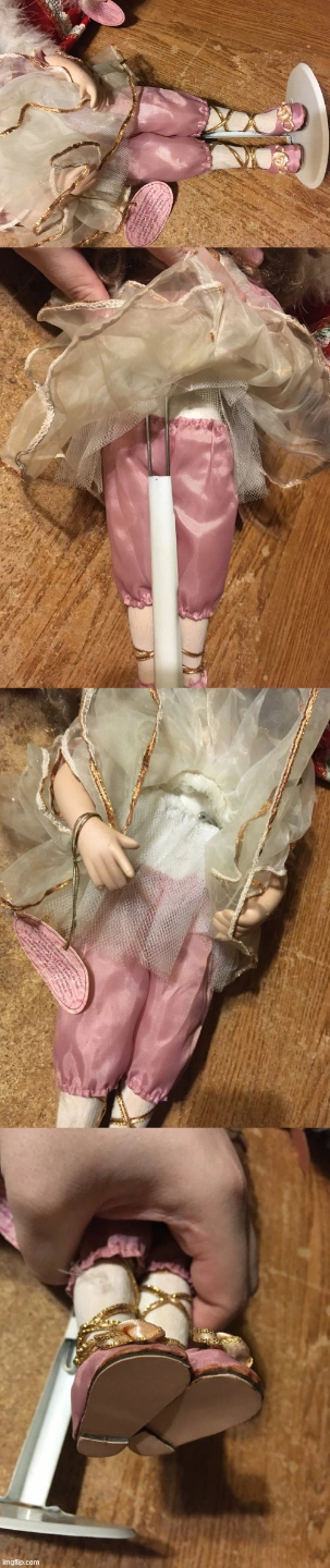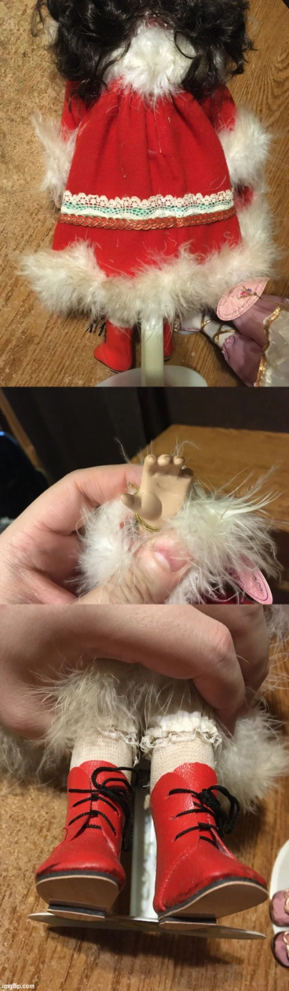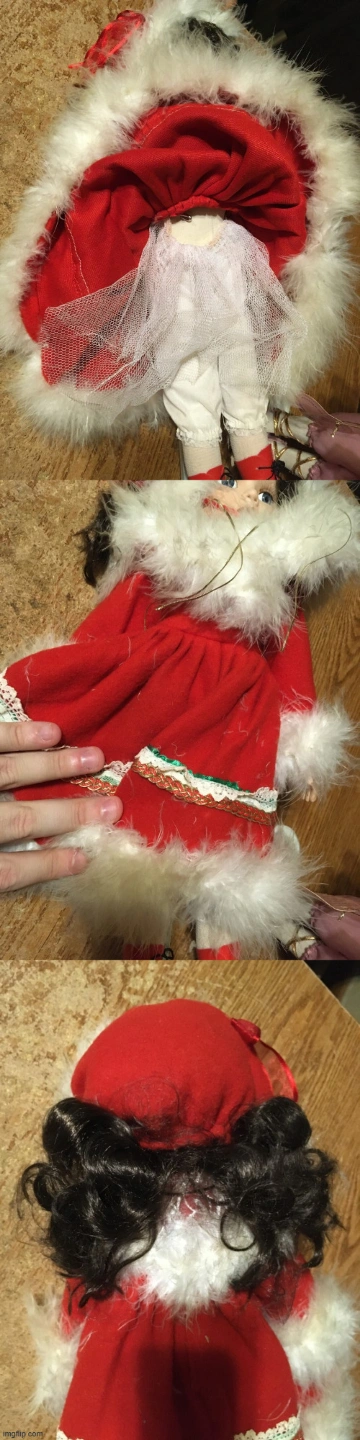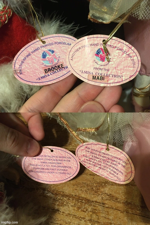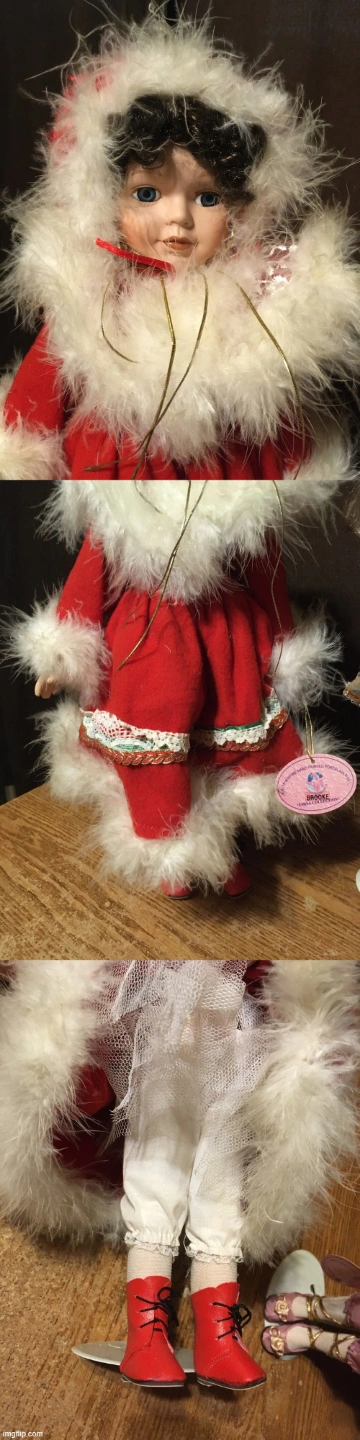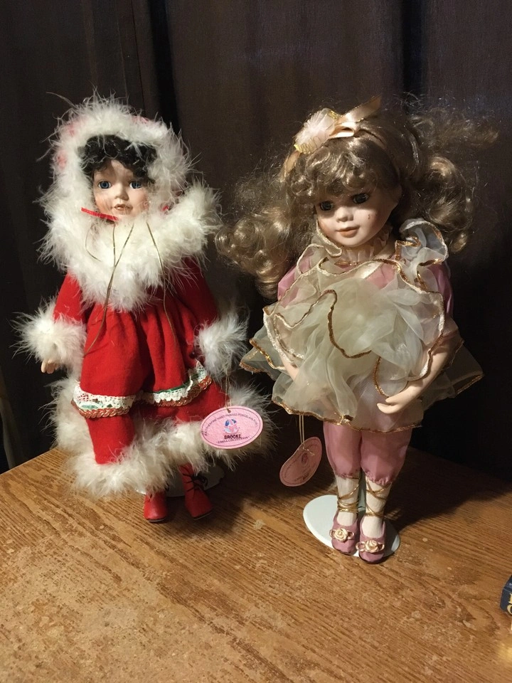 214Set of two porcelain dolls. One wears a red Christmas outfit with white fur trim and red boots. The other doll wears a pink ballerina costume. Both dolls have original tags. The redcoat one has a finger broken shown on picture four and the pink dress one has a mark on one cheek shown on picture seven otherwise good condition pick up at house